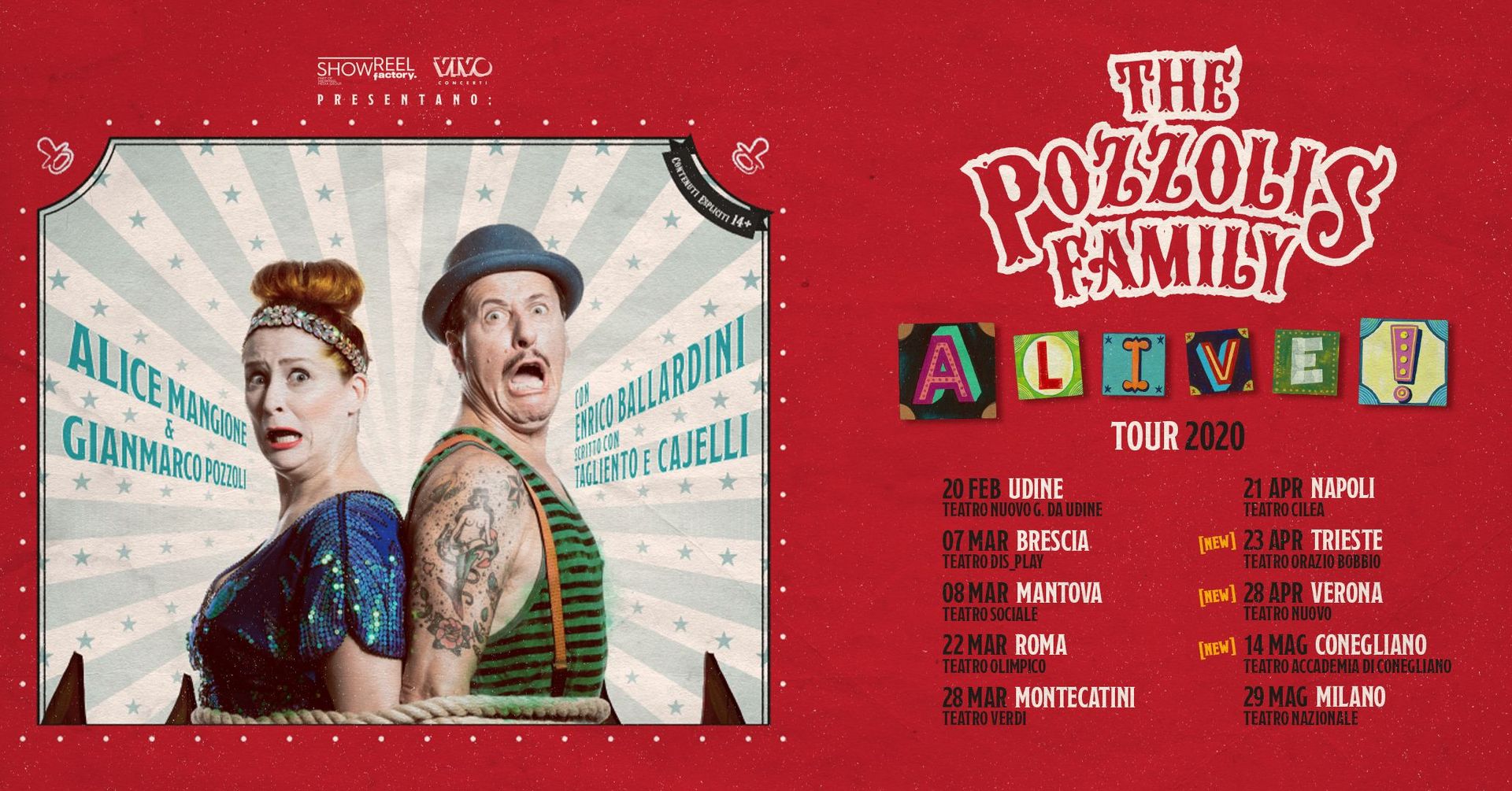 Si aggiungono tre nuove repliche allo spettacolo teatrale "A-LIVE! PERCHÉ SOPRAVVIVERE AI FIGLI È UNA COSA DA RIDERE!” della The Pozzolis Family, previste per giovedì 23 aprile al Teatro Orazio Bobbio di Trieste, martedì 28 aprile al Teatro Nuovo di Verona e, a Conegliano, giovedì 14 maggio presso il Teatro Accademia. Questa lunga ed entusiasmante tournée, prodotta da Vivo Concerti e Show Reel Factory, si concluderà poi il 29 maggio al Teatro Nazionale di Milano.