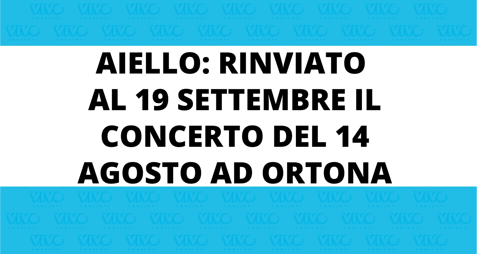 Si comunica che il concerto di AIELLO inizialmente previsto sabato 14/08/2021 presso Piazza San Tommaso di Ortona è stato rinviato a domenica 19/09/2021.