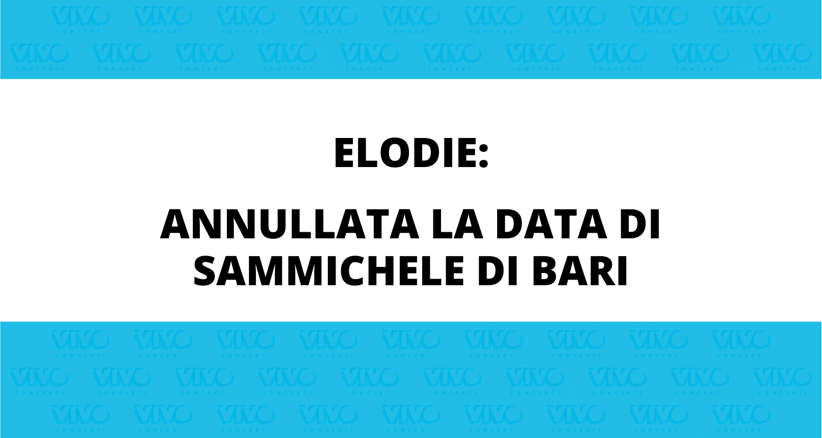 Per motivi non dipendenti dalla volontà dell’artista e per decisione del Comune di Sammichele di Bari, nel rispetto delle regole anti-Covid, il live di Elodie, previsto domenica 13 settembre in occasione del Sammichele Music Festival, è annullato.