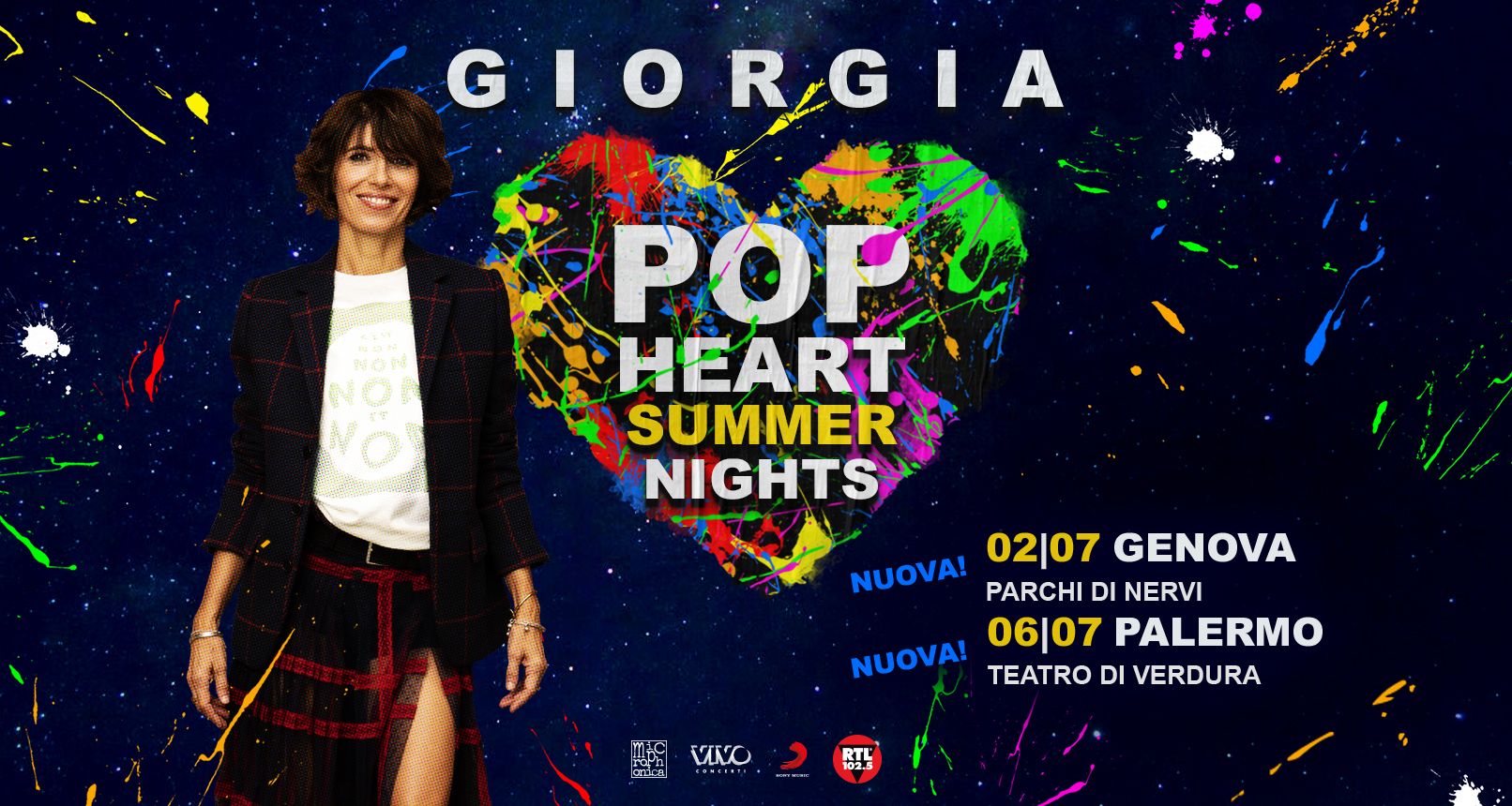 Giovedì 18 aprile 2019– GIORGIA annuncia nuove, imperdibili date della tournée estiva “POP HEART SUMMER NIGHTS”. La grande voce della musica italiana si esibirà martedì 2 luglio presso Parchi di Nervi (Genova) e sabato 6 luglioa Palermo presso Teatro di Verdura.