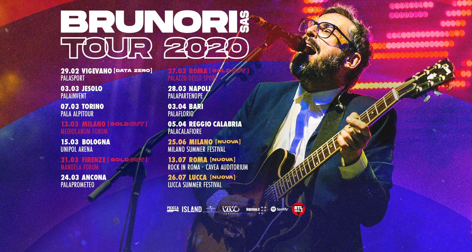 Dopo il clamoroso sold out del Brunori Sas Tour 2020 al Mediolanum Forum di Milano del 13 marzo, registrato a oltre due mesi dal debutto, Dario Brunori mette a segno altri due successi: tutto esaurito infatti anche il concerto al Mandela Forum di Firenze il 21 marzo e al Palazzo dello Sport di Roma il 27 marzo.