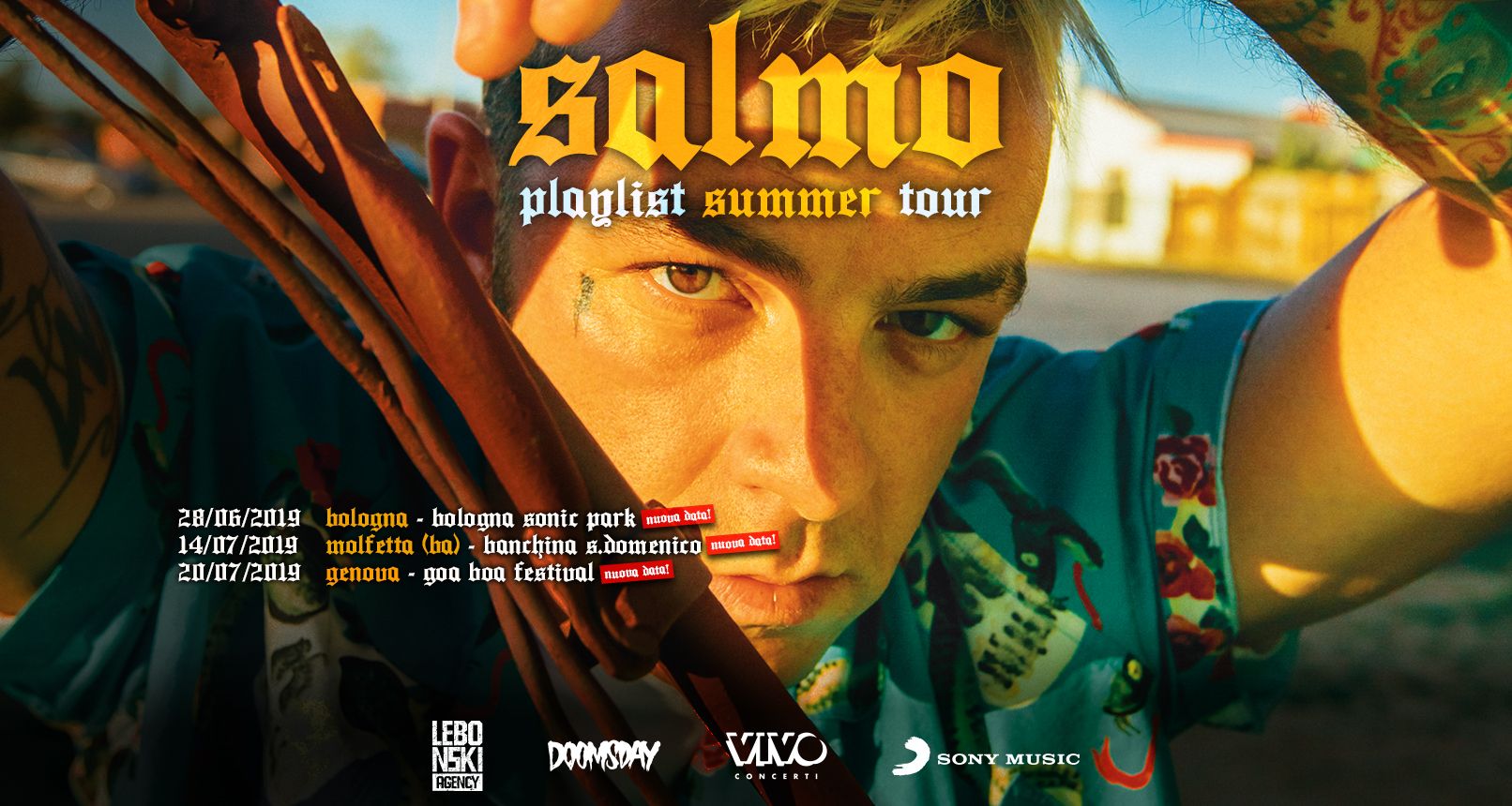 In attesa di calcare i palchi dei principali palazzetti italiani in primavera, SALMO annuncia oggi tre nuove date del “PLAYLIST SUMMER TOUR”: ai live di Roma, Treviso, Barolo e Lucca, si aggiungono i concerti di venerdì 28 giugno 2019 al Bologna Sonic Park; domenica 14 luglio 2019 a Molfetta (BA) presso la Banchina S. Domenico e sabato 20 luglio 2019 al Goa Boa Festival di Genova.