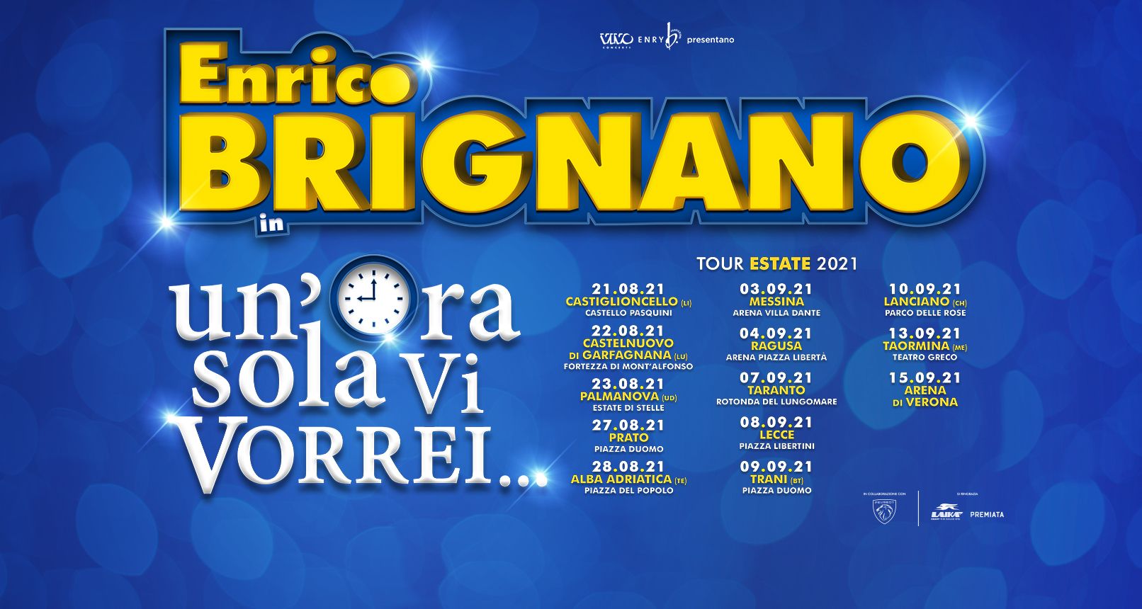 Con “UN’ORA SOLA VI VORREI - ESTATE 2021", Enrico Brignano torna sulle scene con una serie di entusiasmanti date estive, con uno spettacolo che sfida e rincorre il tempo. A spasso nel suo passato, tra ricordi e nuove proposte che rappresentano un ponte gettato sul futuro, Enrico Brignano passeggia sulla linea tratteggiata del nostro presente, saltella tra i minuti, prova a racchiudere il fiume di parole che ha in serbo per il suo pubblico e a concentrarle il più possibile, in un’ora e mezza di spettacolo.
