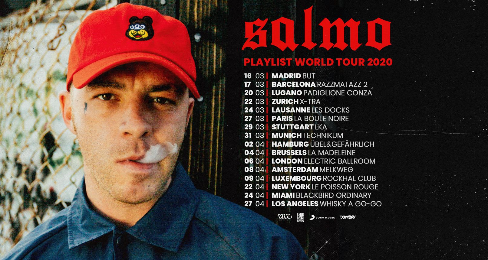4 ottobre 2019- SALMO annuncia il “PLAYLIST WORLDWIDE TOUR 2020” che lo vedrà protagonista sui palchi di sedici città in Europa e negli Stati Uniti.