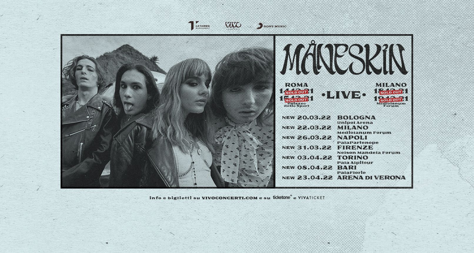 Oltre a questa nuova data oggi sono annunciati i nuovi concerti della tournée che farà tappa il 20 marzo all’Unipol Arena di Casalecchio di Reno (BO), il 26 marzo al PalaPartenope di Napoli, il 31 marzo al Nelson Mandela Forum di Firenze, il 3 aprile al Pala Alpitour di Torino, l’8 aprile al PalaFlorio di Bari e si concluderà nell’iconica Arena di Verona il 23 aprile 2022. Questo sarà un live evento che vedrà i Måneskin con la loro straordinaria energia aprire la stagione dei grandi concerti 2022 dell’Arena.