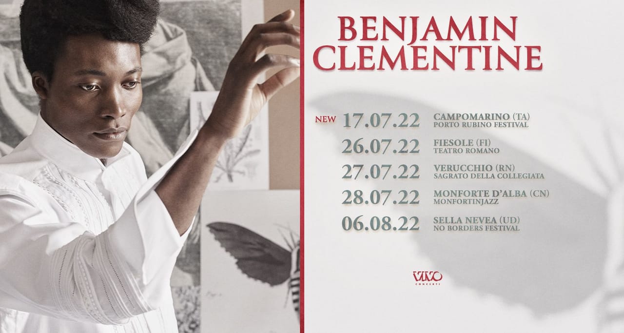 Il poeta e cantautore britannico BENJAMIN CLEMENTINE aggiunge una nuova data in Italia alle quattro già annunciate, che lo vedrà esibirsi a Campomarino di Maruggio (TA) al Porto Rubino Festival domenica 17 luglio 2022.