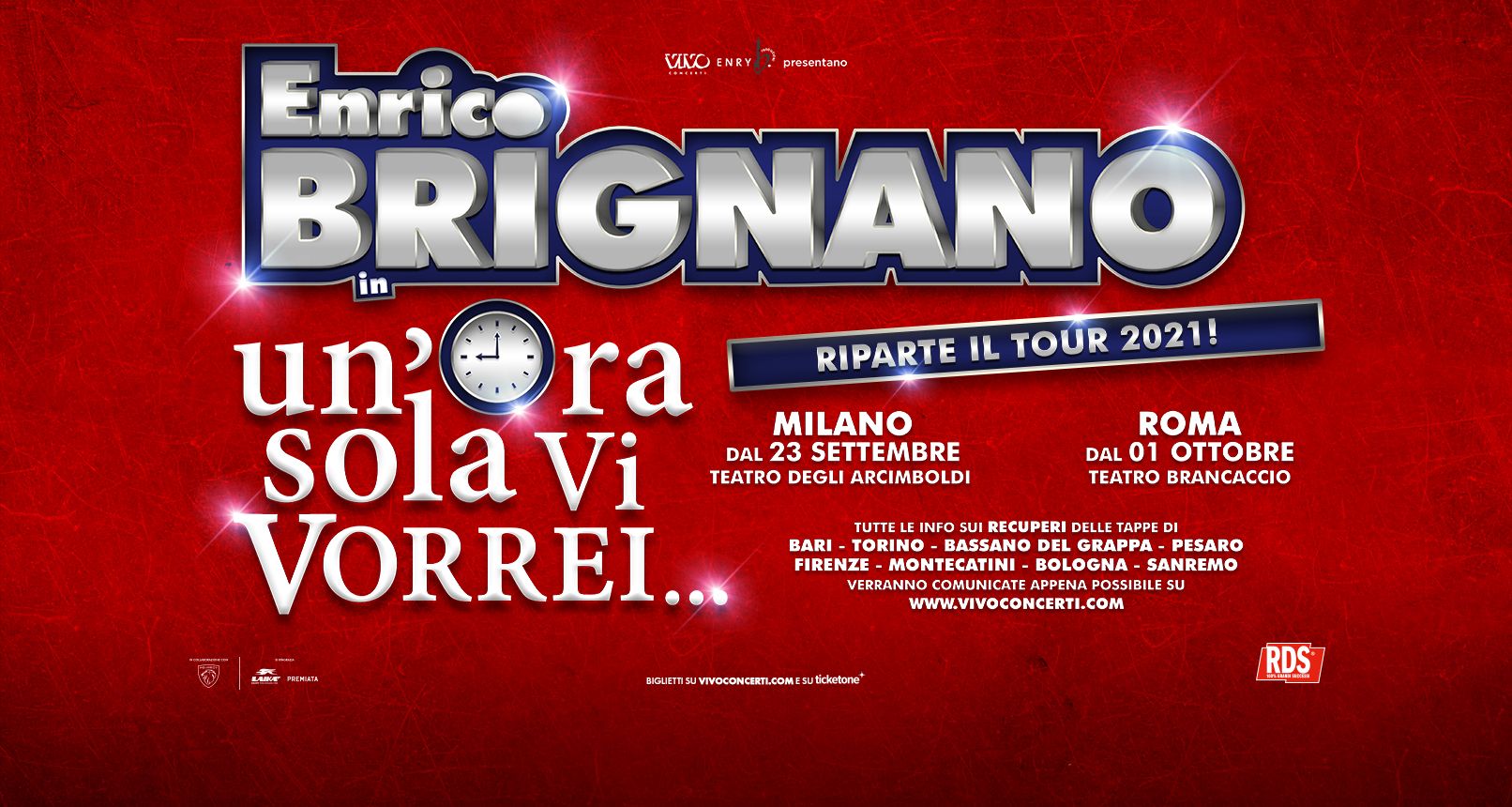 Enrico Brignano riprogramma - in conformità alle disposizioni ministeriali in merito alle capienze Covid - il calendario delle prime due tappe autunnali del suo esilarante show “UN’ORA SOLA VI VORREI", che si terranno rispettivamente al Teatro degli Arcimboldi di Milano e al Teatro Brancaccio di Roma.