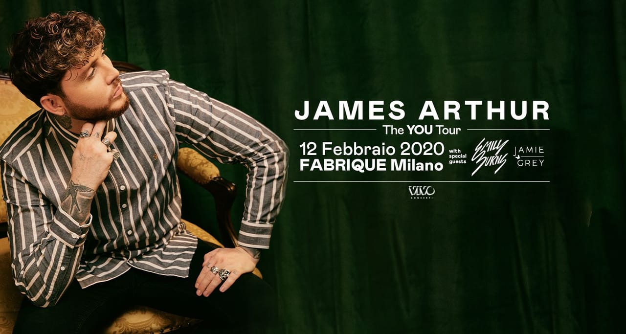 JAMES ARTHUR, l’eclettico cantautore protagonista dello scenario pop inglese, arriva in Italia con una data esclusiva, prodotta da Vivo Concerti, prevista per mercoledì 12 febbraio 2020 al Fabrique di Milano. Ad aprire il suo concerto ci saranno Emily Burns e Jamie Grey.