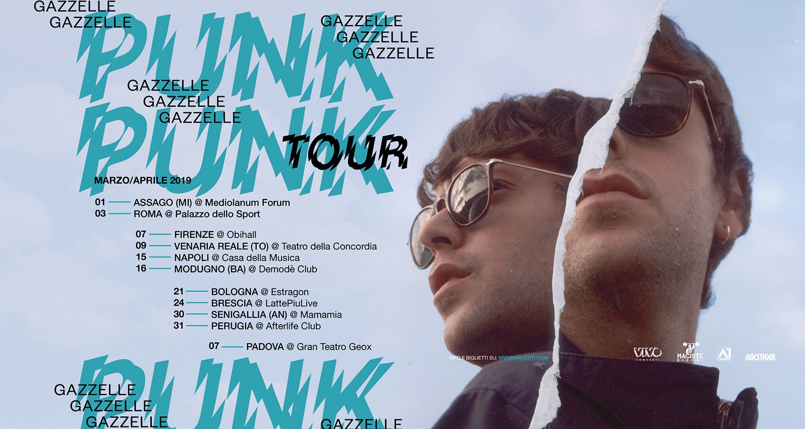 Dopo l’annuncio delle due date esclusive nei palazzetti più importanti d’Italia, al Mediolanum Forum di Milano (01/03/2019) e al Palazzo dello Sport di Roma (03/03), GAZZELLE è pronto a stupire ancora il suo pubblico con il nuovo “PUNK TOUR”, la tournée nei club delle principali città italiane, in partenza da giovedì 7 marzo 2019 all’Obihall di Firenze. Seguiranno i live di Venaria Reale (09/03), Napoli (15/03), Modugno (16/03), Bologna (21/03), Brescia (24/03), Senigallia (30/03), Perugia (31/03) e infine Padova (07/04).
