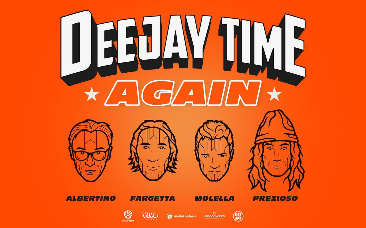 DEEJAY TIME AGAIN sarà uno show rinnovato e unico, che trasporterà il pubblico in quei mitici anni ’90 che hanno visto esplodere il fenomeno della musica elettronica, in un viaggio nel tempo ma che è anche proiettato al futuro, con le più grandi hit da dancefloor italiane e internazionali. I protagonisti del Deejay Time – Albertino, Fargetta, Molella e Prezioso – sono stati dei veri e propri pionieri che hanno saputo scrivere una pagina indelebile della storia della musica dance e dal notevole impatto nella cultura pop italiana che ancora oggi attrae tre generazioni.