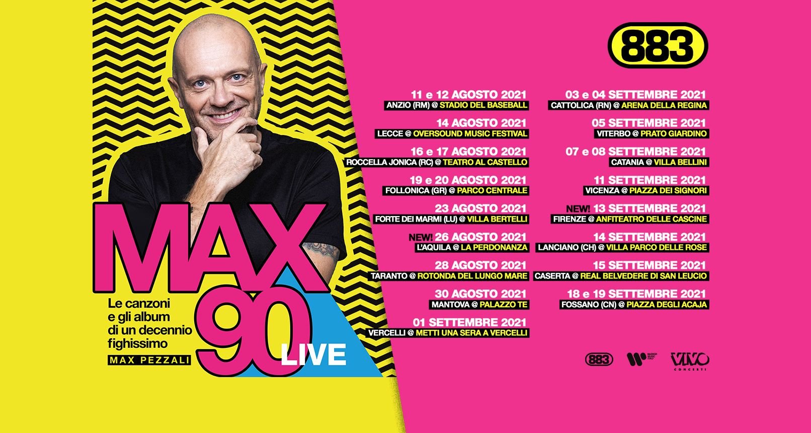 Si aggiungono due nuove date a Max90 Live, il tour prodotto e distribuito da Vivo Concerti che ripercorre i grandi successi degli anni novanta di Max Pezzali. La tournée toccherà L’Aquila ( La Perdonanza – c/o Teatro del Perdono) il 26 agosto 2021 e Firenze (Anfiteatro delle Cascine) il 13 settembre 2021.