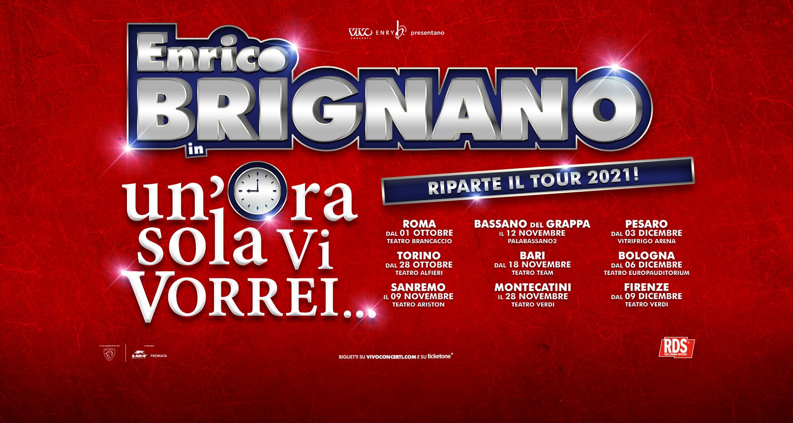Il calendario autunnale di “UN’ORA SOLA VI VORREI", l’esilarante show di Enrico Brignano, viene riprogrammato per le date di Bari, Pesaro e Firenze e vengono confermate quelle di Torino, Sanremo (IM), Bassano del Grappa (VI), Montecatini Terme (PT) e Bologna. Gli spettacoli, organizzati con capienza al 100%, porteranno il comico ad esibirsi in tutta Italia.
