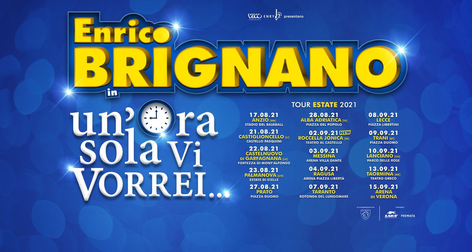 Con “UN’ORA SOLA VI VORREI - ESTATE 2021", Enrico Brignano torna sulle scene con una serie di entusiasmanti date estive, con uno spettacolo che sfida e rincorre il tempo. A spasso nel suo passato, tra ricordi e nuove proposte che rappresentano un ponte gettato sul futuro, Enrico Brignano passeggia sulla linea tratteggiata del nostro presente, saltella tra i minuti, prova a racchiudere il fiume di parole che ha in serbo per il suo pubblico e a concentrare il più possibile, in un’ora e mezza di spettacolo.