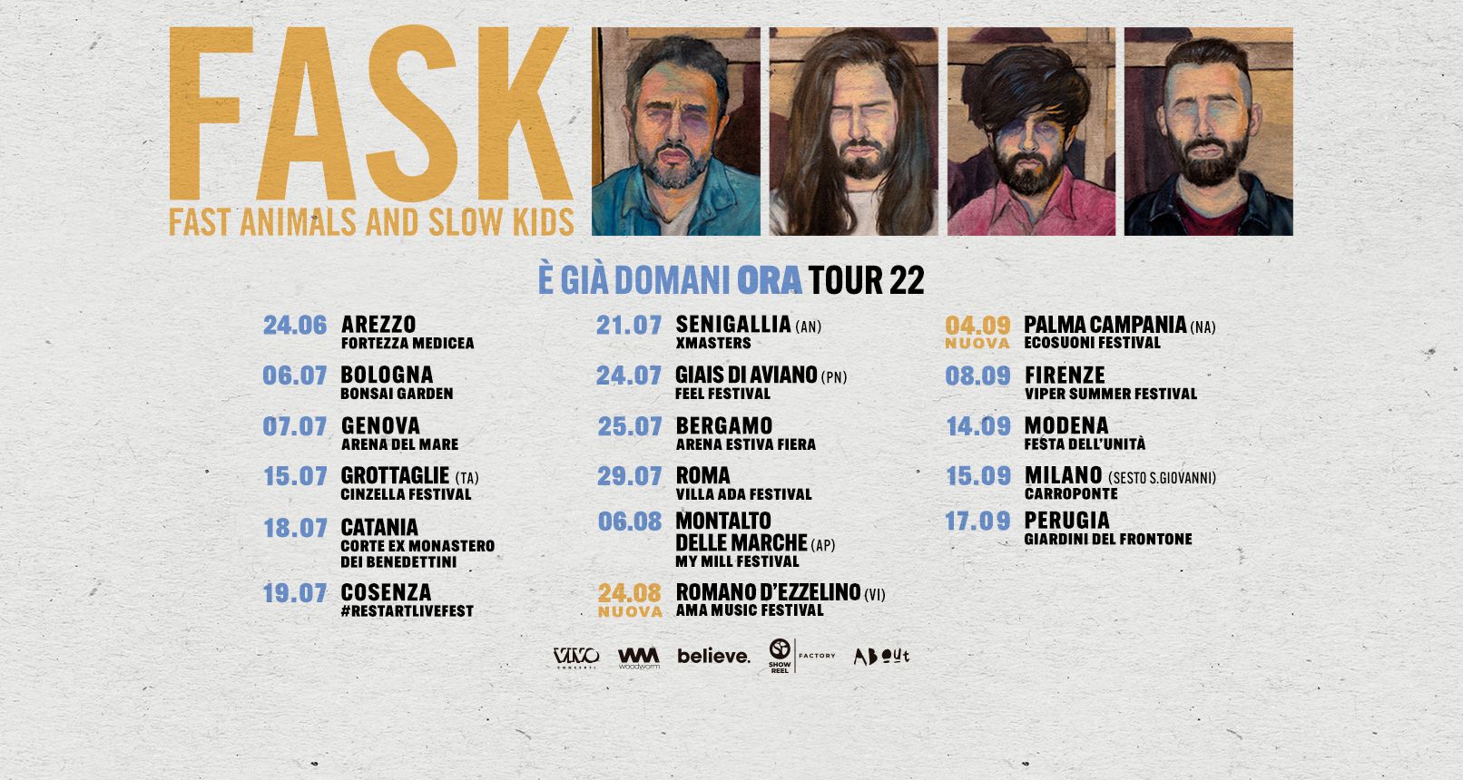 Dopo lo straordinario successo del club tour di aprile e maggio, i FAST ANIMALS AND SLOW KIDS sono pronti a tornare sul palco per un’estate all’insegna del rock con una serie di appuntamenti live nei principali festival e rassegne partendo il 24 giugno da Arezzo.
