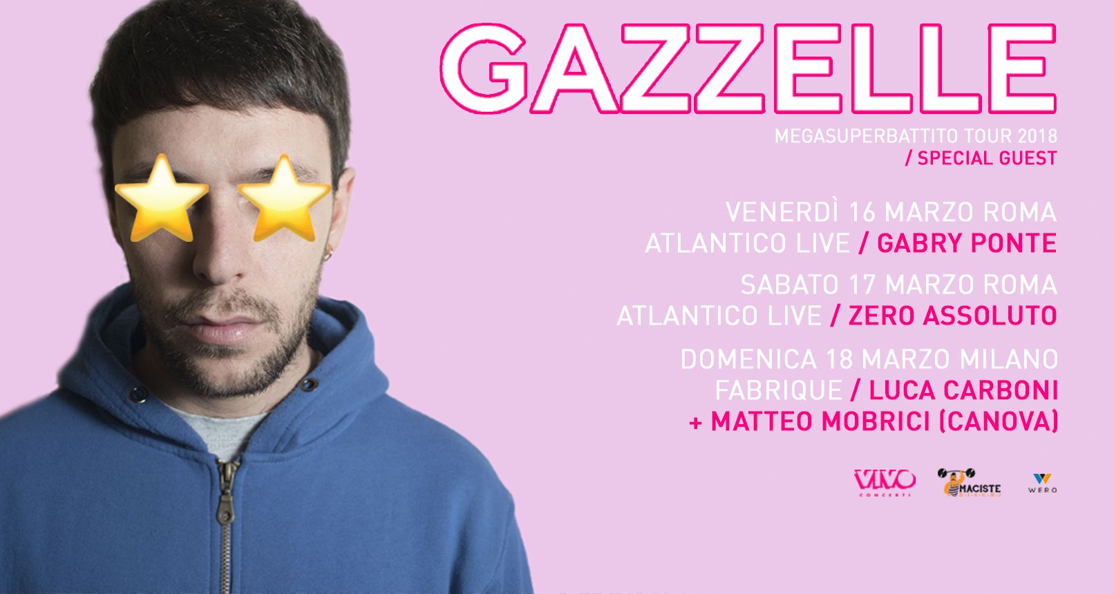 GABRY PONTE a Roma il 16 marzo, ZERO ASSOLUTO a Roma il 17 marzo e LUCA CARBONI + MARCO MOBRICI (dei Canova) il 18 marzo a Milano saranno gli ospiti speciali delle tre date evento di GAZZELLE.