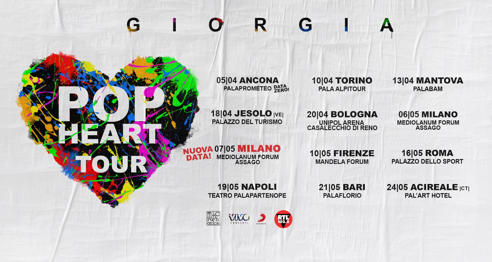 “POP HEART TOUR”toccherà anche le città di Ancona, Torino, Mantova, Jesolo (VE), Casalecchio di Reno (BO), Milano, Firenze, Roma, Napoli, Bari e Acireale (CT).