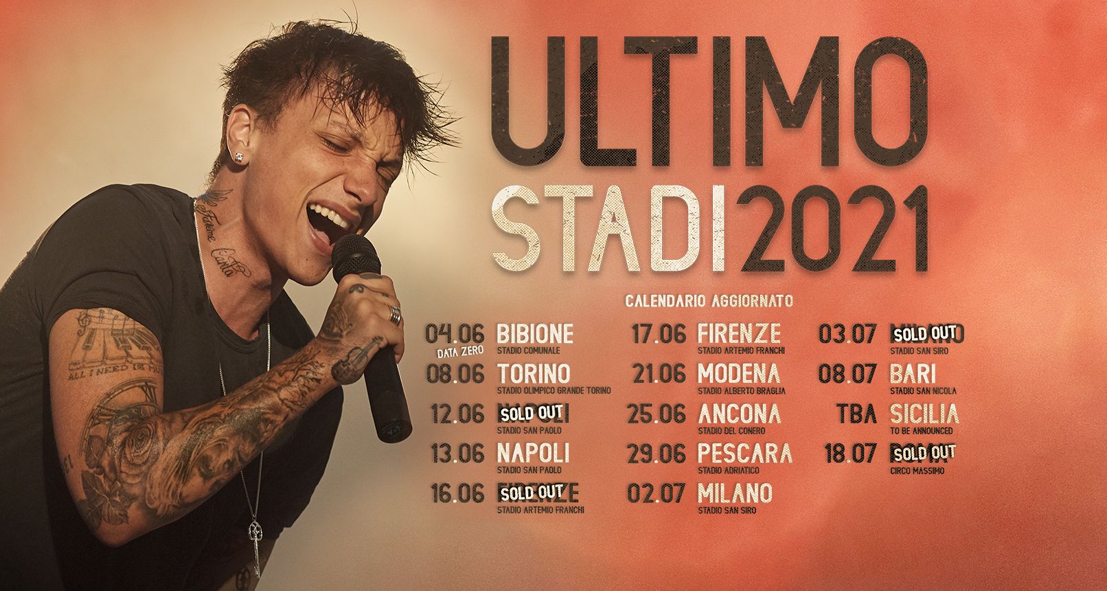 ULTIMO sarà il più giovane artista italiano di sempre a esibirsi negli stadi, dove canterà live a partire dalla data zero del 4 giugno 2021 allo Stadio Comunale di Bibione. Il tour farà poi tappa a Torino (Stadio Olimpico Grande Torino, 8 giugno), Napoli (Stadio San Paolo, 12 giugno sold out e 13 giugno), Firenze (Stadio Artemio Franchi, 16 giugno sold out e 17 giugno), Modena (Stadio Alberto Braglia, 21 giugno), Ancona (Stadio del Conero, 25 giugno), passando per Pescara (Stadio Adriatico Giovanni Cornacchia, 29 giugno), Milano (Stadio San Siro, 2 luglio e 3 luglio sold out), Bari (Stadio San Nicola, 8 luglio), e si concluderà il 18 luglio 2021 a Roma (sold out), con l’evento speciale di chiusura del tour al Circo Massimo.