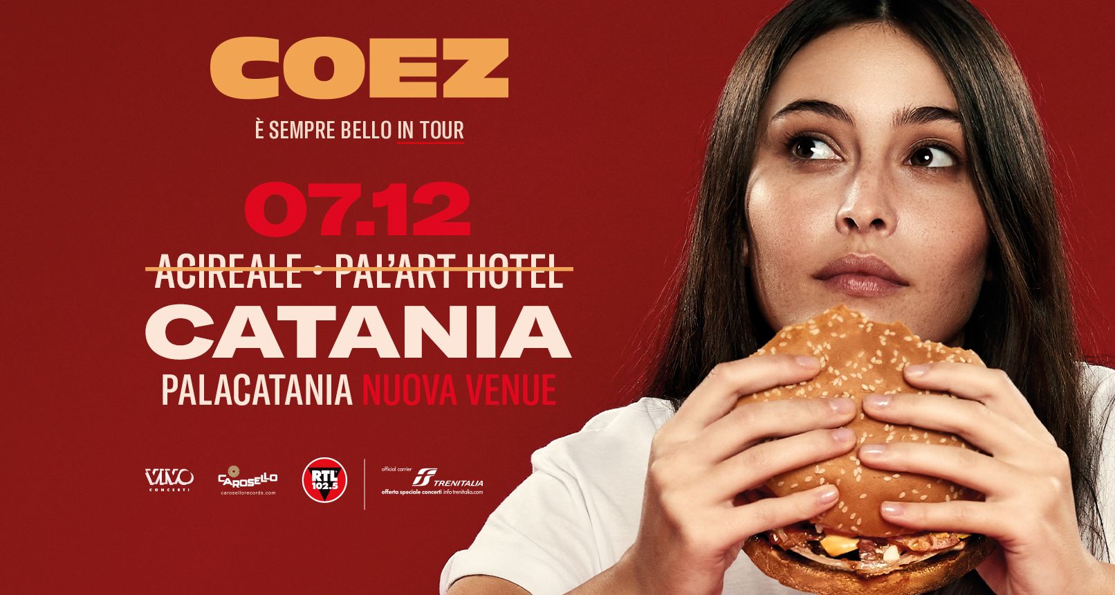 Vivo Concerti comunica che il concerto di Coez in programma sabato 7 dicembre al Pal’Art Hotel di Acireale si terrà al PalaCatania di Catania