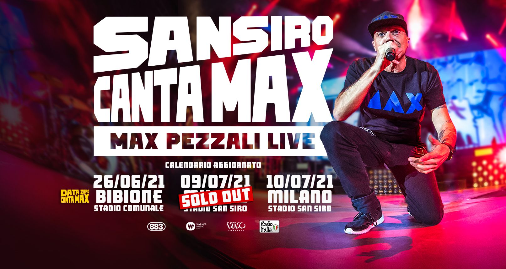 Le due date evento di SAN SIRO CANTA MAX vengono riprogrammate per venerdì 9 luglio (sold out) e sabato 10 luglio 2021 e vedranno MAX PEZZALI per la prima volta protagonista sul palco dello stadio San Siro di Milano. Gli attesissimi live, prodotti e organizzati da Vivo Concerti, saranno anticipati dalla data zero prevista per sabato 26 giugno 2021 allo Stadio Comunale di Bibione (VE).