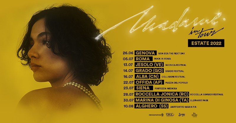 Dopo il successo del tour che da maggio porterà l’artista sui palchi dei Club italiani, “MADAME IN TOUR”, prodotto e organizzato da Friends & Partners e Vivo Concerti in collaborazione con Big Picture Management e Sugar Music, continuerà anche in estate: arrivano oggi, a grande richiesta, 10 nuovi appuntamenti outdoor che vedranno MADAME protagonista dei principali Festival estivi.