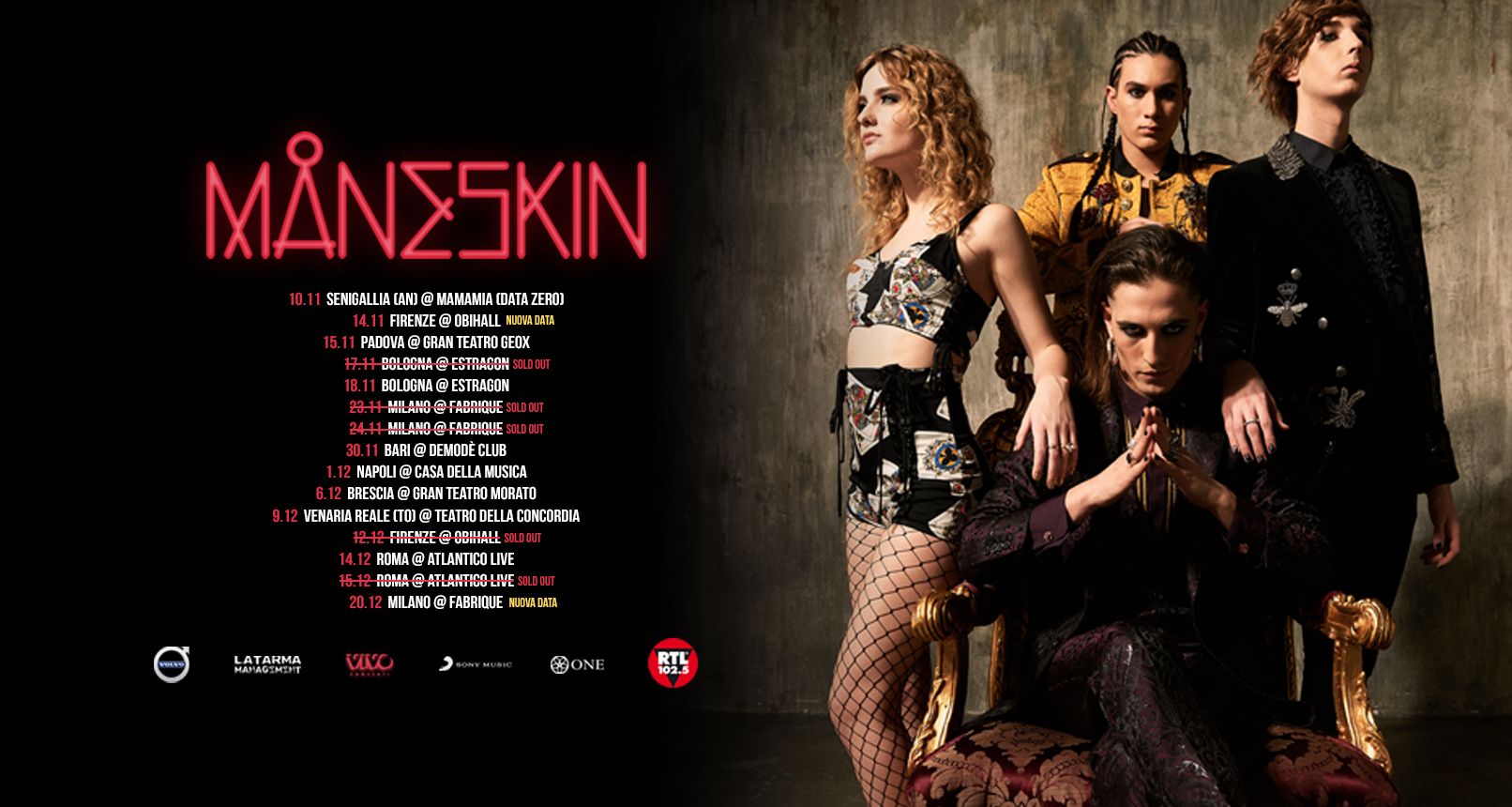 Volano le vendite del tour da poco annunciato dei Måneskin. Dopo il tutto esaurito delle prime date di Milano, Bologna e Roma in poche ore dall’apertura delle vendite, anche la seconda data milanese e l’appuntamento di Firenze sono sold out. Si aggiunge così una terza data a Milano, il 20 dicembre 2018 sempre al Fabrique, mentre a Firenze si raddoppia con il concerto del 14 novembre all’Obihall.