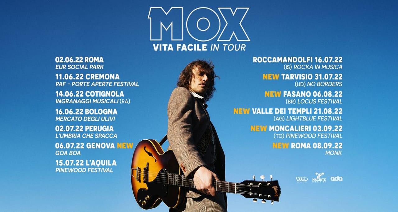 MOX, nome d’arte di Marco Santoro, annuncia nuove date del VITA FACILE in tour, la tournée estiva prodotta e distribuita da Vivo Concerti in cui il cantautore romano porta sul palco il suo stile inconfondibile.