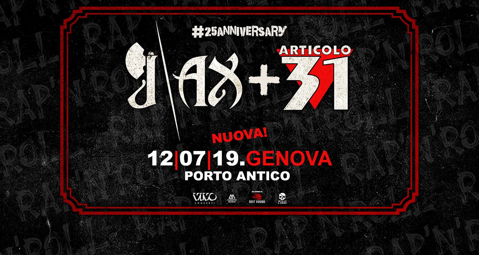 Dopo aver annunciato il concerto evento nella meravigliosa cornice dell’Arena di Verona, il tour di J-AX + Articolo 31si arricchisce di un nuovo appuntamento estivo, che vedrà il duo protagonista anche sul palco di Genova, venerdì 12 luglio 2019 al Porto Antico.
