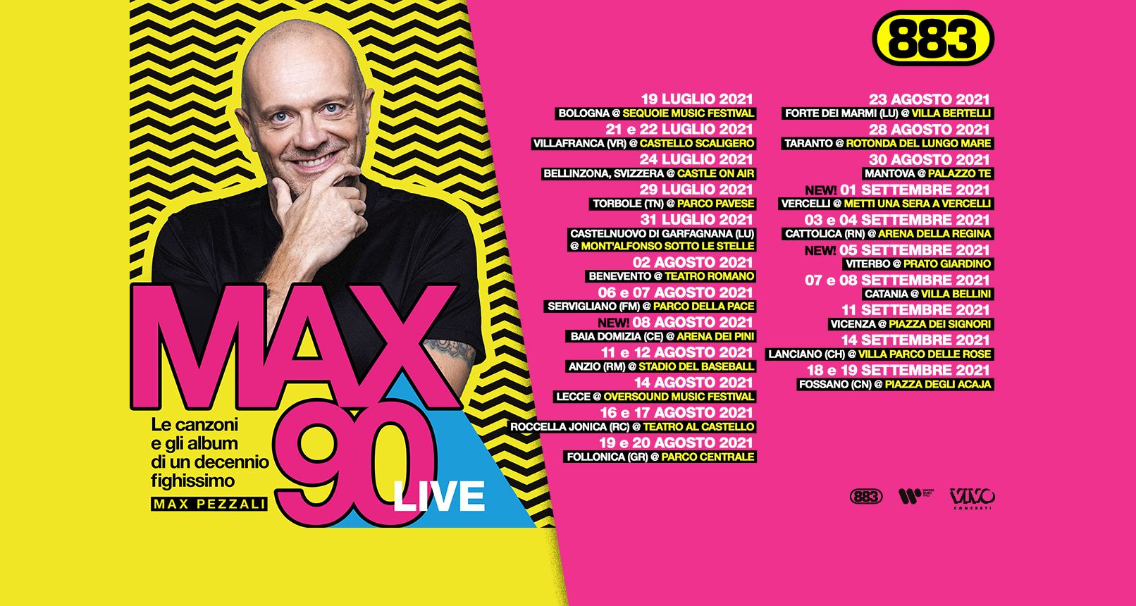 Si aggiungono nuove date al Max90 Live, il tour prodotto e distribuito da Vivo Concerti che ripercorre i grandi successi degli anni novanta di Max Pezzali, e che ora arriverà anche all’Arena dei Pini a Baia Domizia (CE) l’8 agosto, al “Metti una sera a Vercelli in Piazza dell’antico ospedale di Vercelli l’1 settembre e a Prato Giardino, Viterbo il 5 settembre.