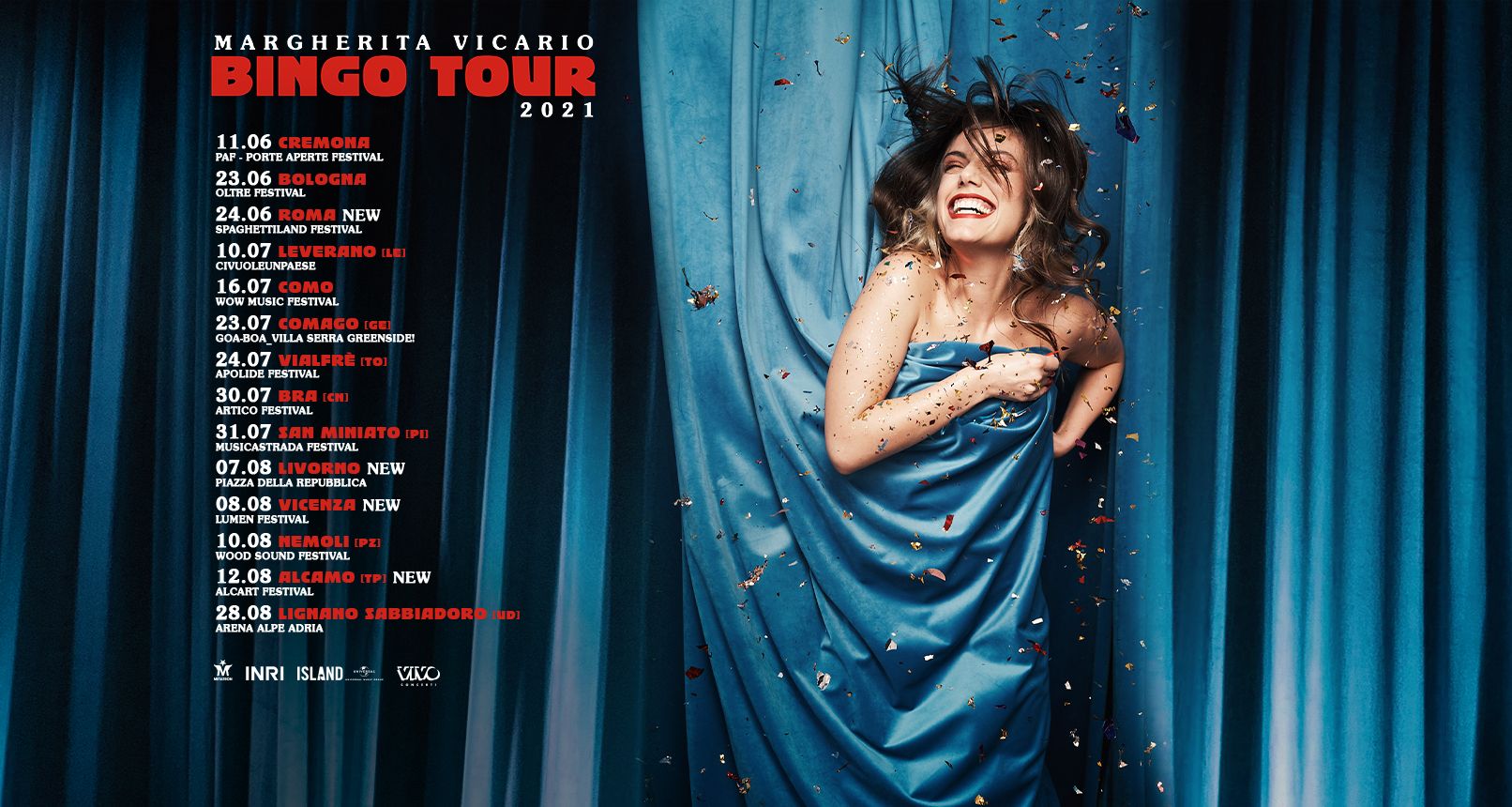 28 maggio 2021 - A pochi giorni dall’uscita del suo nuovo album, Margherita Vicario annuncia l’aggiunta di ulteriori appuntamenti del BINGO TOUR, il tour dell’estate 2021 che porterà la cantautrice in tutta italia. Gli spettacoli, prodotti e distribuiti da Vivo Concerti, si terranno anche a Roma allo Spaghettiland Festival il 24 giugno, a Livorno in Piazza della Repubblica il 7 agosto, a Vicenza al Lumen Festival l’8 agosto e ad Alcamo al Alcart Festival il 12 agosto.
