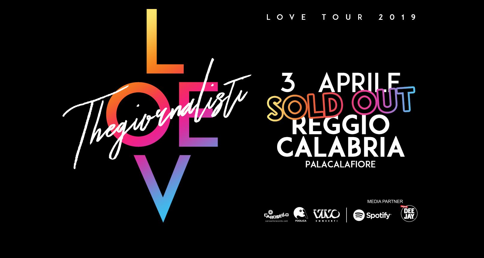 Non accennano a fermarsi i THEGIORNALISTI, che, dopo aver annunciato la speciale data evento al Circo Massimo il 7 settembre 2019 a Roma (#LOVEalMASSIMO), registrano il tutto esaurito anche al PalaCalafiore di Reggio Calabria per il live di mercoledì 3 aprile 2019.La tranche primaverile del “LOVE TOUR 2019”, partita il 26 marzo da Jesolo, ha già totalizzato 13 live sold out su 15 tappe, con oltre 250.000 biglietti venduti.