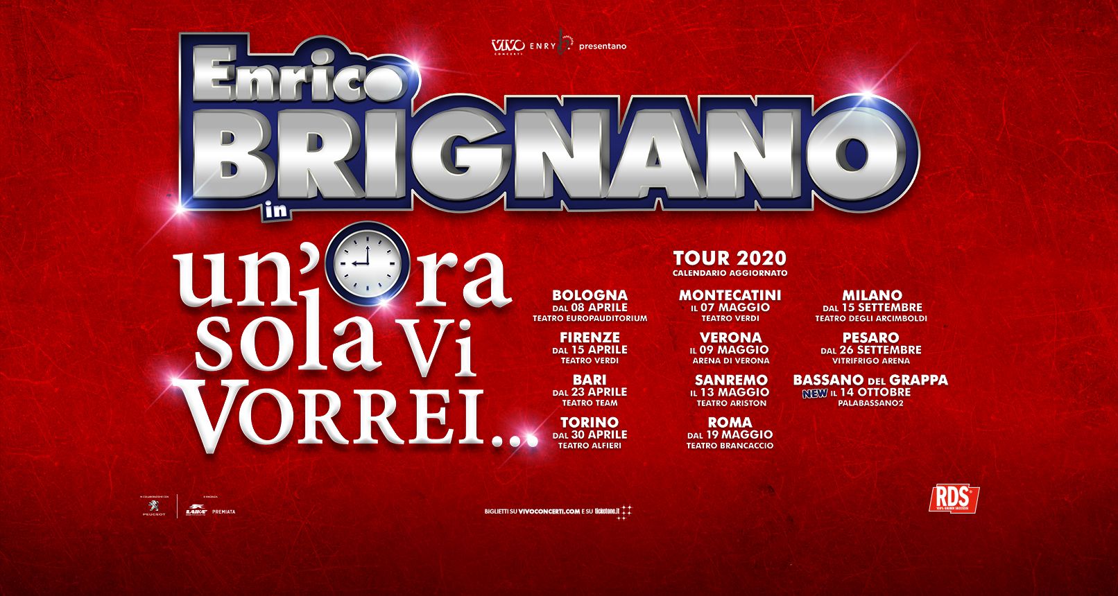 In seguito all’emergenza COVID-19, Vivo Concerti posticipa la replica di BASSANO DEL GRAPPA dello spettacolo “Un’ora sola vi vorrei”. Originariamente previsto per il 4 aprile, il one man show di ENRICO BRIGNANO è riprogrammato a mercoledì 14 ottobre 2020 al Palabassano2. I biglietti già acquistati resteranno validi per la nuova data.