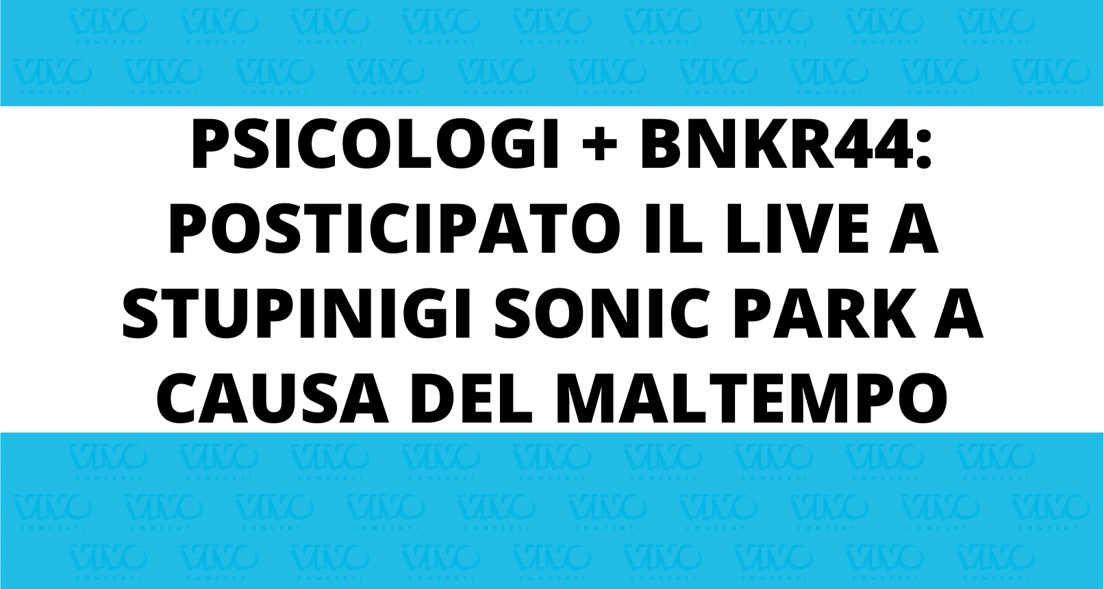 Viste le condizioni climatiche avverse, in accordo con gli organizzatori, Vivo Concerti comunica che il live di PSICOLOGI + BNKR44 previsto per il 25 luglio a Stupinigi Sonic Park, Nichelino (TO), è rimandato a data da destinarsi.
