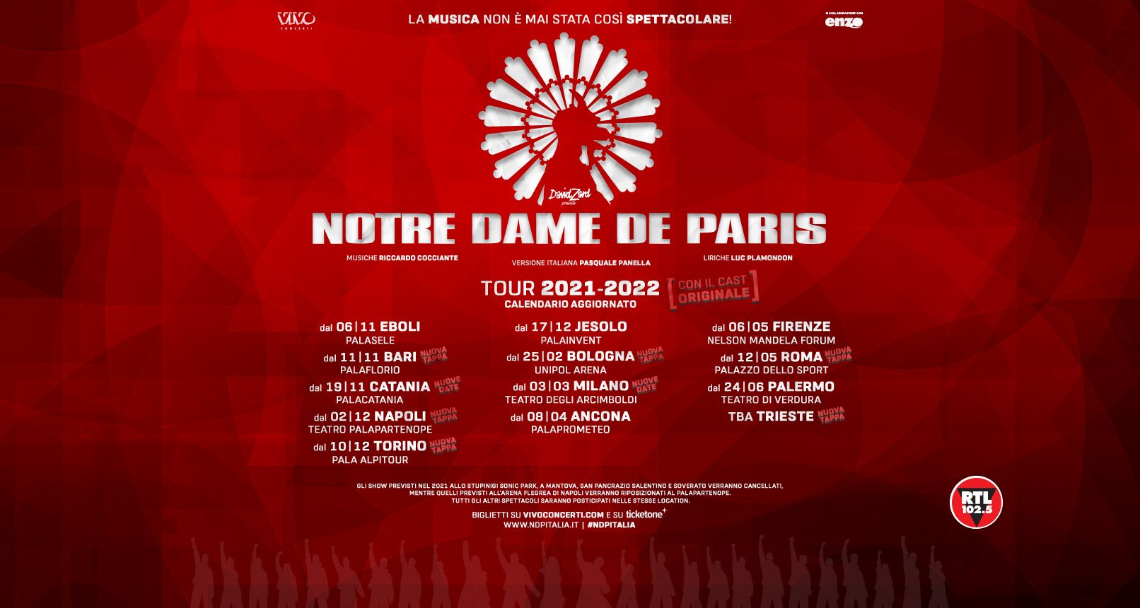 In seguito al rinvio del tour 2020 di Notre Dame de Paris, dovuto allo Stato d’Emergenza per la situazione pandemica che sta interessando l’Italia e il resto del mondo, la tournée dell’opera popolare più amata di sempre si prepara a tornare in scena e lo fa rinnovando il calendario, a partire dall’autunno 2021 e per tutto il 2022.
