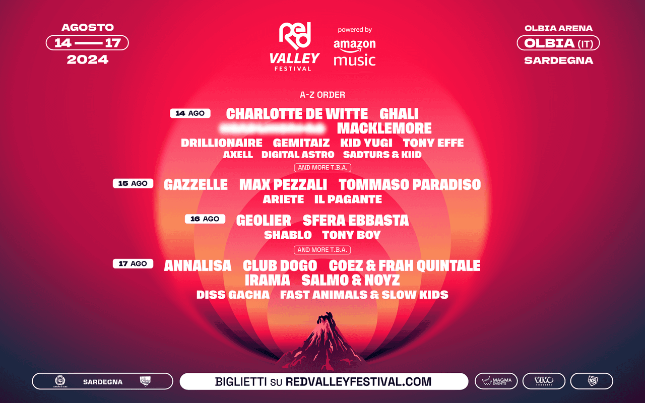 Con un'affluenza di oltre 70mila persone nel 2022 e oltre 105mila persone nel 2023, il RED VALLEY - powered by Amazon Music, prodotto e organizzato da Magma Events e Vivo Concerti, con la partnership radiofonica di Radio 105 - nella sua ottava edizione promette 4 giorni intensissimi con concerti live, dj set, oltre ad attività collaterali all’insegna della musica e del divertimento a partire dalle ore 18.
