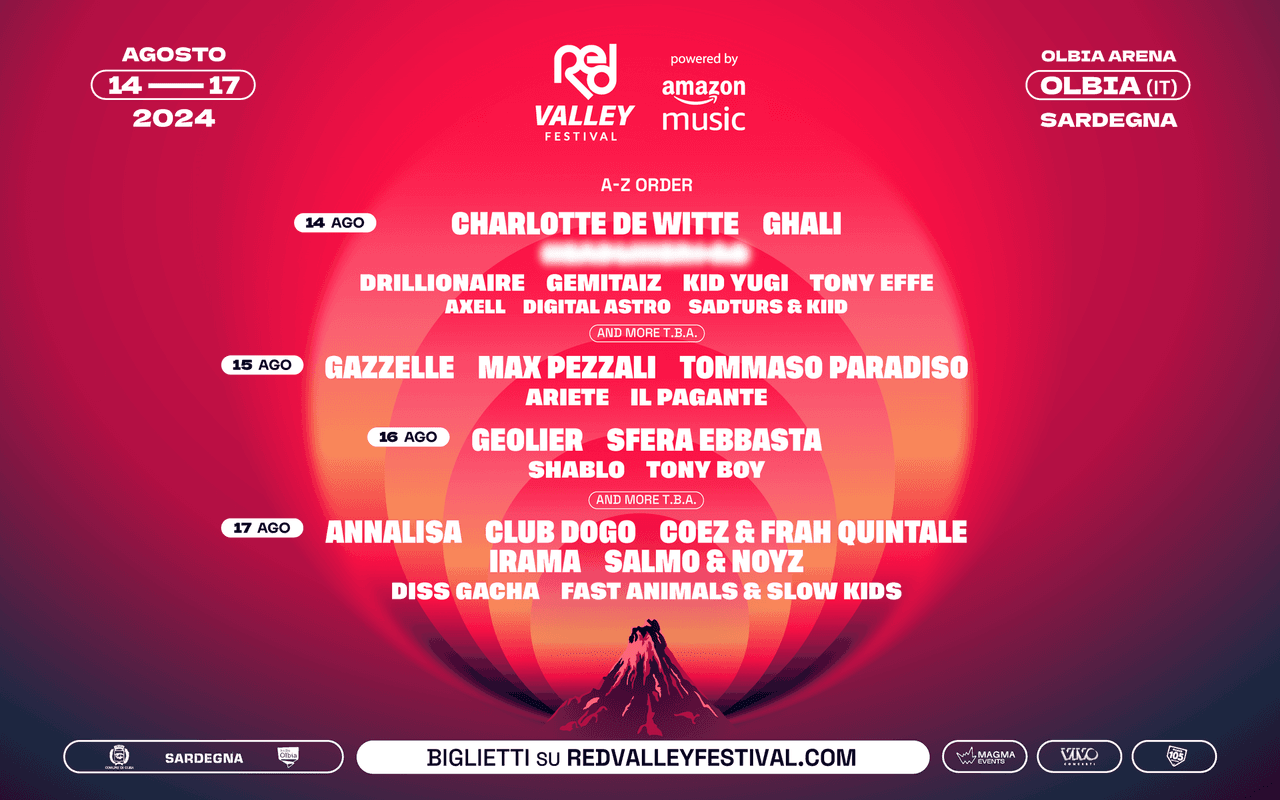 Con un'affluenza di oltre 70mila persone nel 2022 e oltre 105mila persone nel 2023, il RED VALLEY - powered by Amazon Music, prodotto e organizzato da Magma Events e Vivo Concerti, con la partnership radiofonica di Radio 105 - nella sua ottava edizione promette 4 giorni intensissimi con concerti live, dj set, oltre ad attività collaterali all’insegna della musica e del divertimento a partire dalle ore 18.