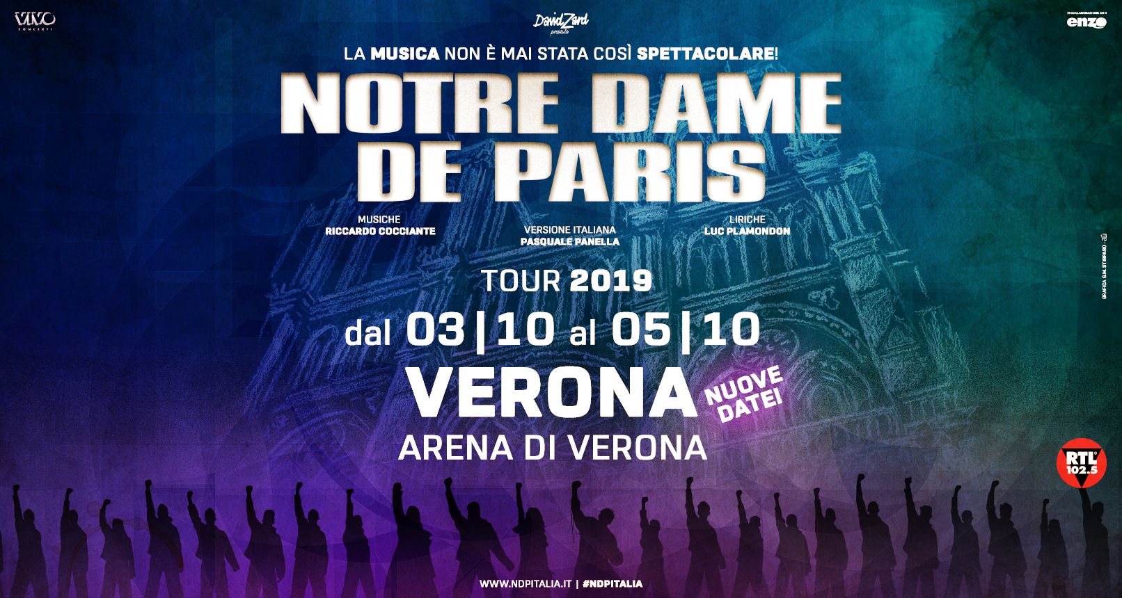 NOTRE DAME DE PARIS debuttava nella sua versione originale francese il 16 settembre 1998, al Palais des Congrèsdi Parigi, dove fu subito trionfo. Quattro anni dopo, David Zard produceva la versione italiana con l’adattamento di Pasquale Panella, il 14 marzo 2002, al Gran Teatro di Roma, costruito per l’occasione, si teneva la “prima” di quello che sarebbe stato il musical dei record, un’emozione che, da allora, ha “contagiato” 4 milioni di spettatori. Un successo travolgente che ha raggiunto non solo il pubblico di Francia e Italia, ma quello di tutto il mondo: Inghilterra, Svizzera, Russia, Canada, fino a Cina, Giappone, Corea del Sud, Libano, Turchia, insieme a decine di altri paesi, riscuotendo ovunque un numero di presenze senza precedenti.