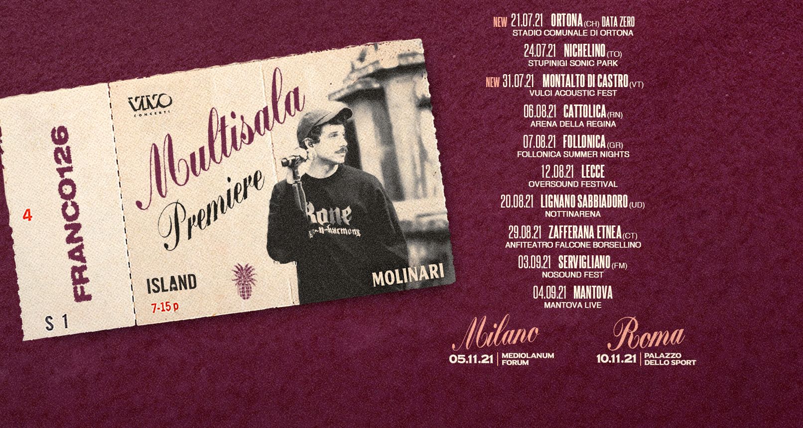 Milano 16 giugno 2021 - Si aggiungono due nuove date al MULTISALA PREMIERE, il tour di Franco126 che partirà a luglio e attraverserà l’Italia toccando le maggiori Arene e Festival del Paese nei prossimi mesi estivi. Le nuove date vedranno Franco 126 esibirsi a: Ortona ( Campo Sportivo, mercoledì 21 luglio 2021) e a Vulci (Vulci Acoustic Fest, sabato 31 luglio 2021)