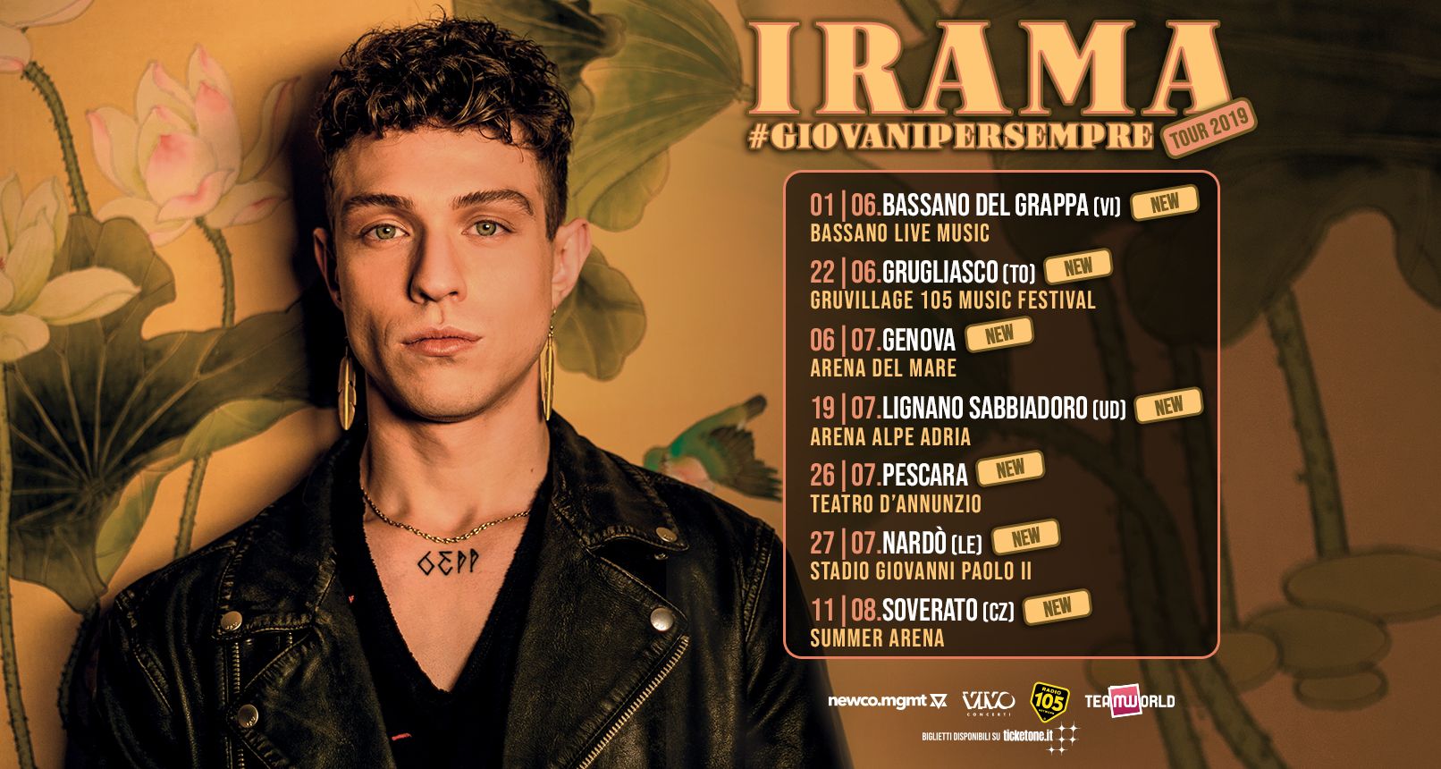 Dopo aver dato il via alla tranche invernale della tournée, 16 appuntamenti in cui il giovane cantautore sarà protagonista sui palchi dei principali club italiani con un live speciale già sold out al Mediolanum Forum di Milano, IRAMA si prepara a tornare da giugno 2019 e farà tappa a Bassano del Grappa inPiazza della Libertà (01/06), passando perilGruVillage 105 Music Festival 2019 di Grugliasco(22/06), l’Arena del Mare diGenova(06/07),Lignano Sabbiadoro all’Arena Alpe Adria (19/07), ilTeatro D’Annunzio di Pescara (26/07) per finire poi allo Stadio Giovanni Paolo II di Nardò (27.07) e alla Summer Arenadi Soverato(11.08).