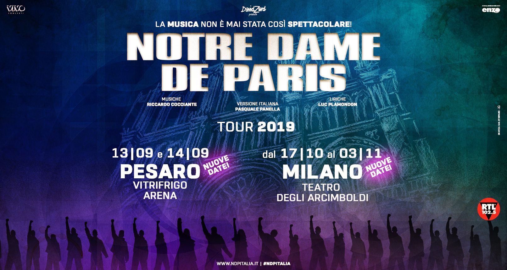 Dopo aver appassionato più di 4 milioni di spettatori solo in Italia, “Notre Dame de Paris”, uno tra gli spettacoli teatrali più apprezzati al mondo, tratto dall’omonimo romanzo di Victor Hugo,torna a far sognare con nuove imperdibili tappe. Lo show arriverà alla Vitrifrigo Arena di Pesaro il 13 e 14 settembre 2019e sarà in replica a Milano anche dal 29 ottobre al 3 novembre 2019, date che si affiancano a quelle già annunciate, sempre presso il Teatro degli Arcimboldi di Milano.
