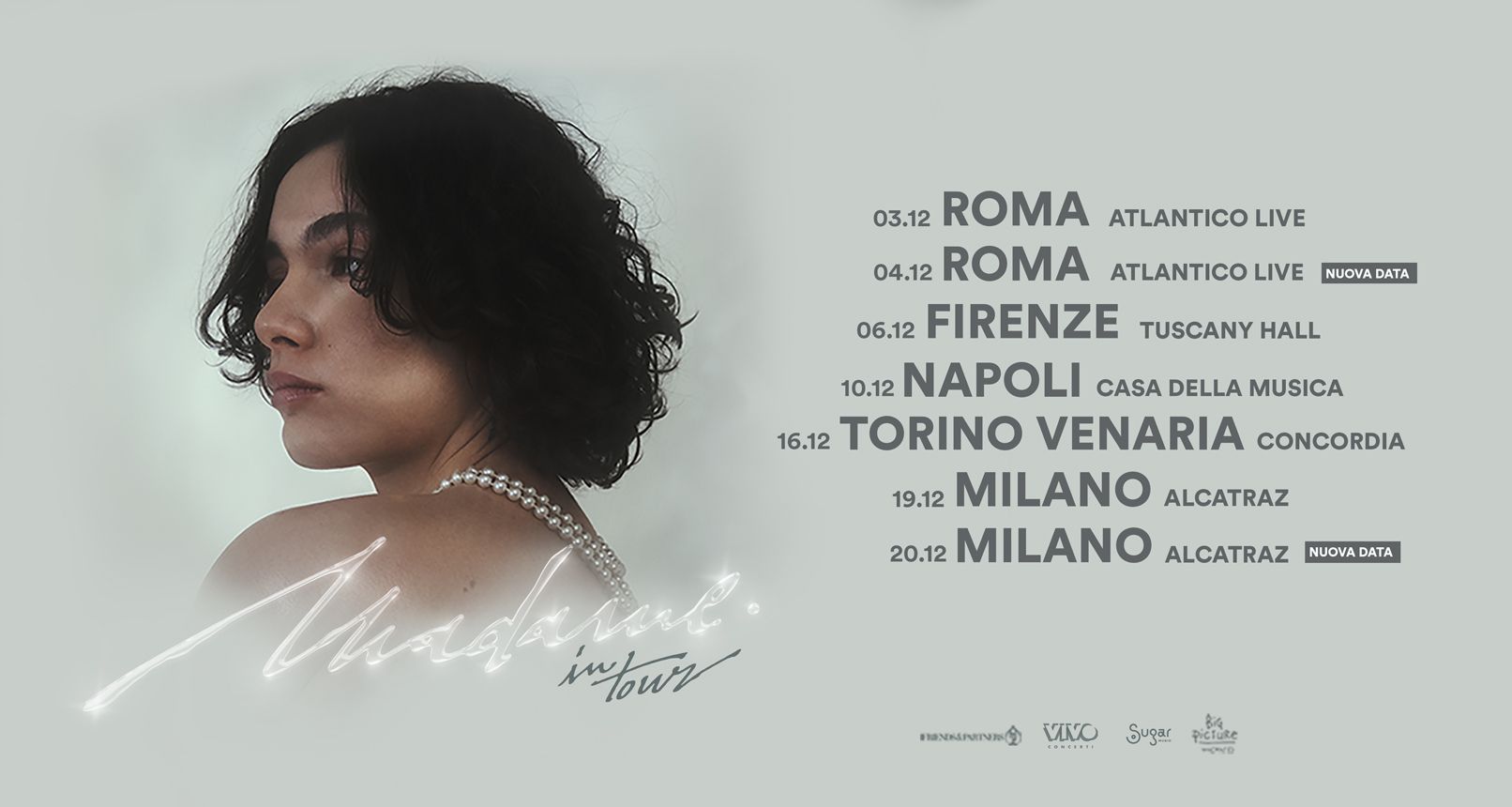 Madame, 19 anni, dopo aver pubblicato con Sugar il suo primo album in un progetto semplicemente intitolato “Madame”, annuncia il raddoppio delle date di Roma e Milano del suo primo tour: alla data già prevista a Roma per il 3 dicembre si aggiunge una nuova data il 4 dicembre, mentre a Milano si aggiunge l’appuntamento del 20 dicembre a quello già previsto il 19 dicembre.