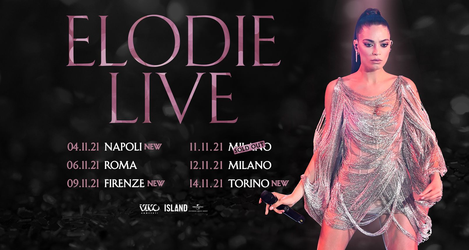 La cantante romana porterà la sua musica in sei show a lungo attesi, programmati nel mese di novembre 2021, a partire da Pozzuoli (NA), giovedì 4, al Duel Beat, proseguendo a Roma, sabato 6, presso il Teatro Centrale, e in seguito a Firenze, martedì 9, all’Auditorium Flog. Successivamente, Elodie si esibirà in un doppio appuntamento a Milano, presso la Santeria Toscana 31, giovedì 11 (sold out) e venerdì 12. Concluderà la tournée il concerto previsto a Torino, domenica 14, presso l’Hiroshima Mon Amour.