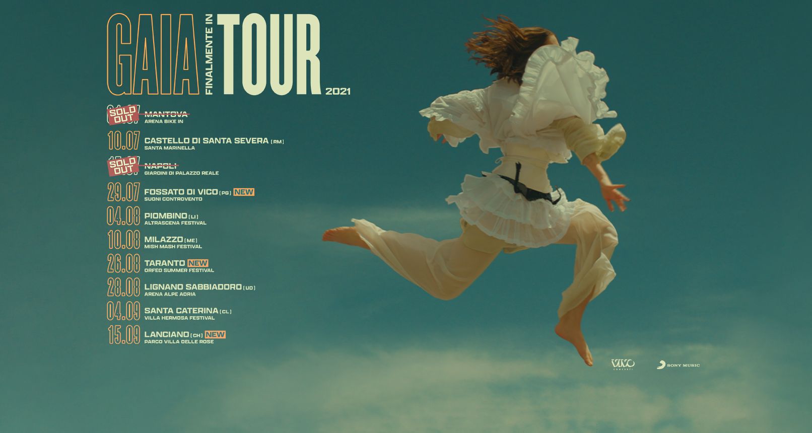 Dopo la prima data a Mantova, il tour proseguirà per Santa Marinella (Roma), sabato 10 al Castello di Santa Severa, a seguire sarà a Napoli ai Giardini di Palazzo Reale, sabato 17 luglio, e a Fossato di Vico (PG) per Suoni Controvento il 29 luglio. Il 04 agosto GAIA porterà la sua musica a Piombino (LI) all’Altrascena Festival, martedì 10 agosto al Mish Mash Festival, il 26 agosto a Taranto per l’Orfeo Summer Festival e sabato 28 agosto a Lignano Sabbiadoro all’Arena Alpe Adria. A settembre il tour estivo continua con la data di sabato 04 a Santa Caterina (CL) al Villa Hermosa Festival e si concluderà mercoledì 15 settembre al Parco Villa delle Rose di Lanciano (CH).