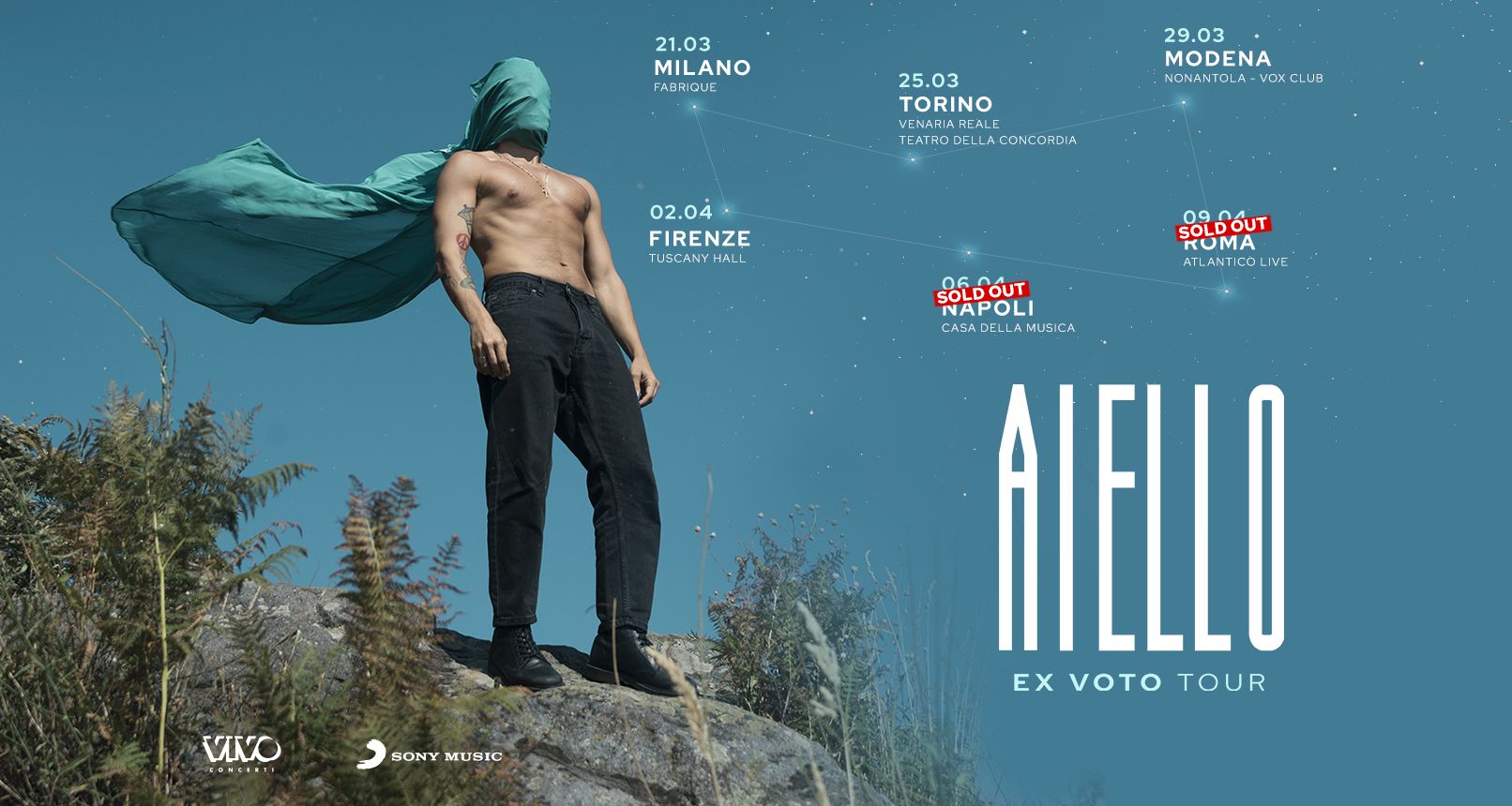 Dopo il sold out di Napoli, AIELLO, artista rivelazione del panorama musicale italiano, registra il tutto esaurito anche per la tappa conclusiva dell’EX VOTO TOUR 2020, prevista a Roma presso l’Atlantico Live, giovedì 9 aprile.