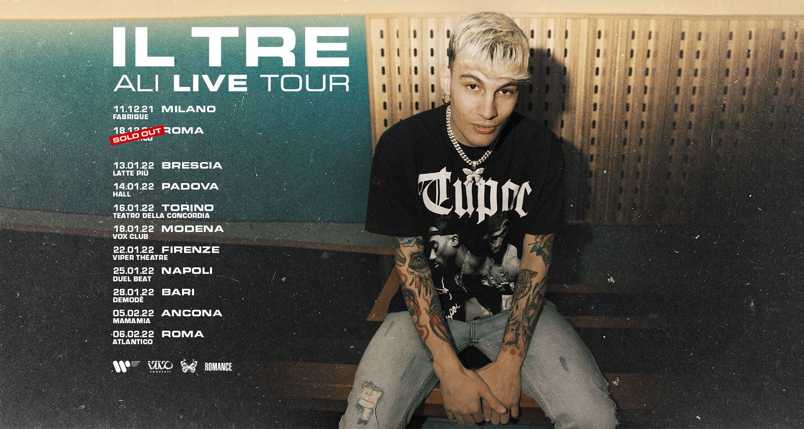A partire da gennaio 2022 toccherà inoltre: Brescia - 13 gennaio, Padova - 14 gennaio, Venaria Reale (TO) - 16 gennaio, Nonantola (MO) - 18 gennaio, Firenze - 22 gennaio, Pozzuoli (NA) - 25 gennaio, Bari - 28 gennaio, Senigallia (AN) - 5 febbraio, per chiudere con il raddoppio all’Atlantico di Roma il 6 febbraio 2022.