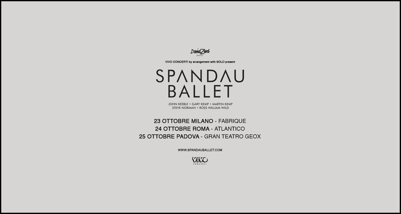 Non perdete l’occasione di assistere dal vivo alle tre date evento che vedranno la nuova formazione degli Spandau Ballet protagonista dei live di martedì 23 ottobre 2018 a Milano al Fabrique, mercoledì 24 ottobre all’Atlantico Live di Roma e giovedì 25 ottobre al Gran Teatro Geox a Padova.