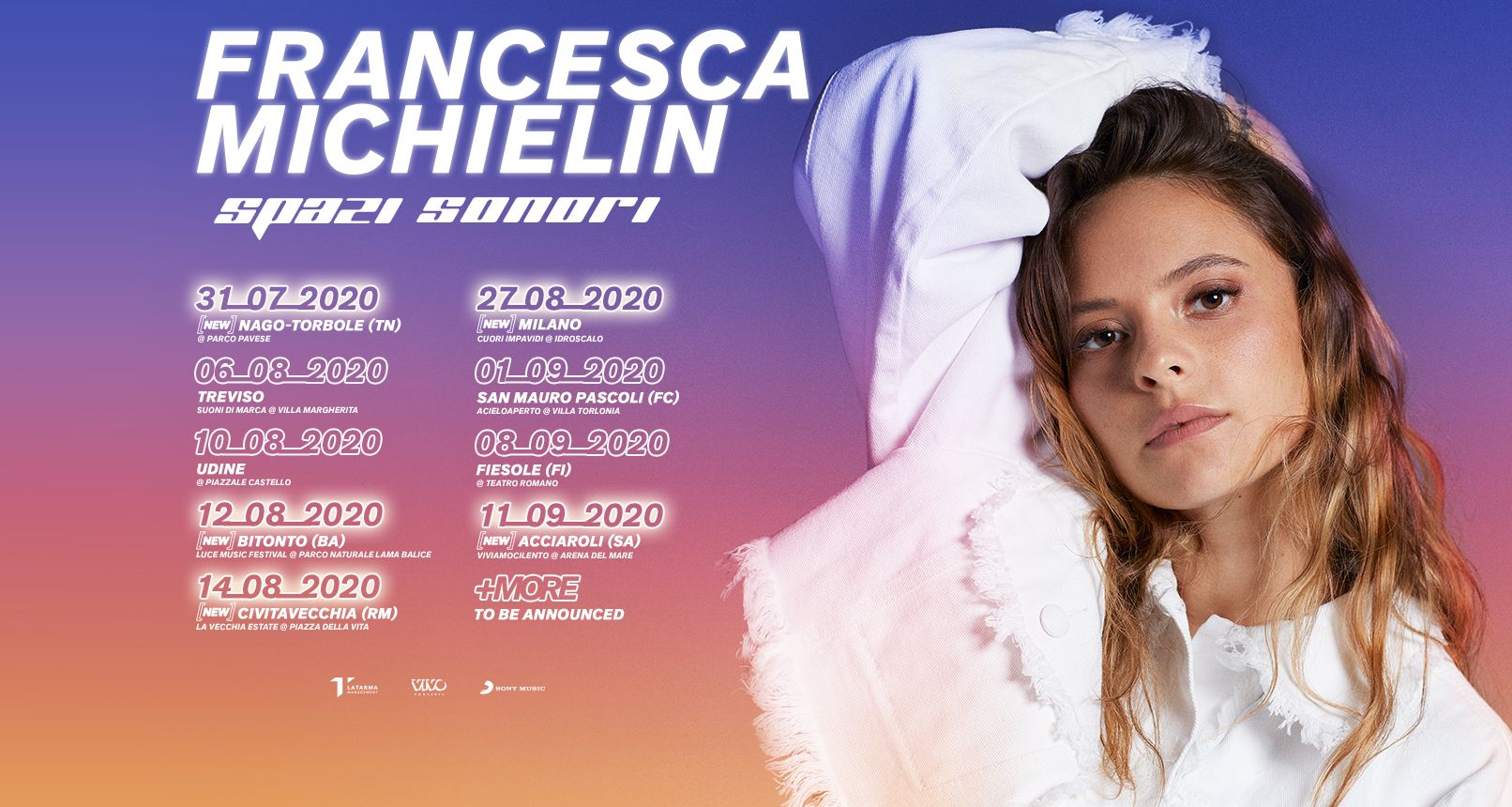 Spazi Sonori, il nuovo viaggio live di Francesca Michielin per l’estate 2020 prodotto da Vivo Concerti si arricchisce di cinque nuovi speciali appuntamenti: un segnale forte, ancora una volta a dimostrazione che la musica non si ferma. Sono tante le nuove date che vedranno la cantautrice e polistrumentista protagonista dei palchi allestiti in alcune tra le più particolari location del nostro Paese, in piena sicurezza e nel rispetto delle disposizioni governative. Oltre all’appuntamento già annunciato del 27 agosto al festival Cuori Impavidi all’Idroscalo di Milano, Francesca Michielin sarà il 31 luglio nel Parco Pavese di Nago-Torbole (TN), il 12 agosto a Bitonto (BA), nel Parco Naturale Lama Balice per il Luce Music Festival, il 14 agosto a Civitavecchia in Piazza della Vita all’interno della rassegna La vecchia estate e l’11 settembre ad Acciairoli (SA), nella suggestiva Arena del Mare all’interno del festival Viviamocilento. Oltre alla partecipazione ad iniziative importanti come Heroes - Il futuro inizia adesso, il live a sostegno dei lavoratori della musica che il 6 settembre vedrà salire sul palco dell’Arena di Verona i grandi nomi della musica italiana, il calendario di Francesca Michielin si arricchirà presto di nuovi appuntamenti.