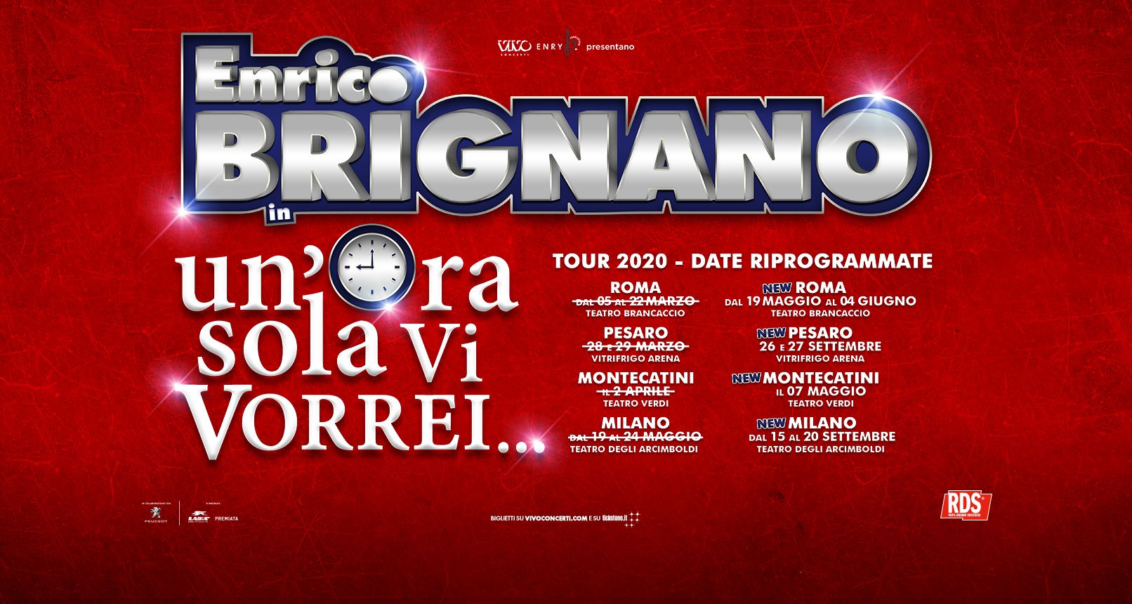 In seguito alle disposizioni ministeriali, Vivo Concerti posticipa le repliche di “Un’ora sola vi vorrei”, one man show di ENRICO BRIGNANO, previste al Teatro Brancaccio di ROMA, alla Vitrifrigo Arena di PESARO, al Teatro Verdi di MONTECATINI e al Teatro degli Arcimboldi di MILANO. I biglietti già acquistati resteranno validi per le nuove date.