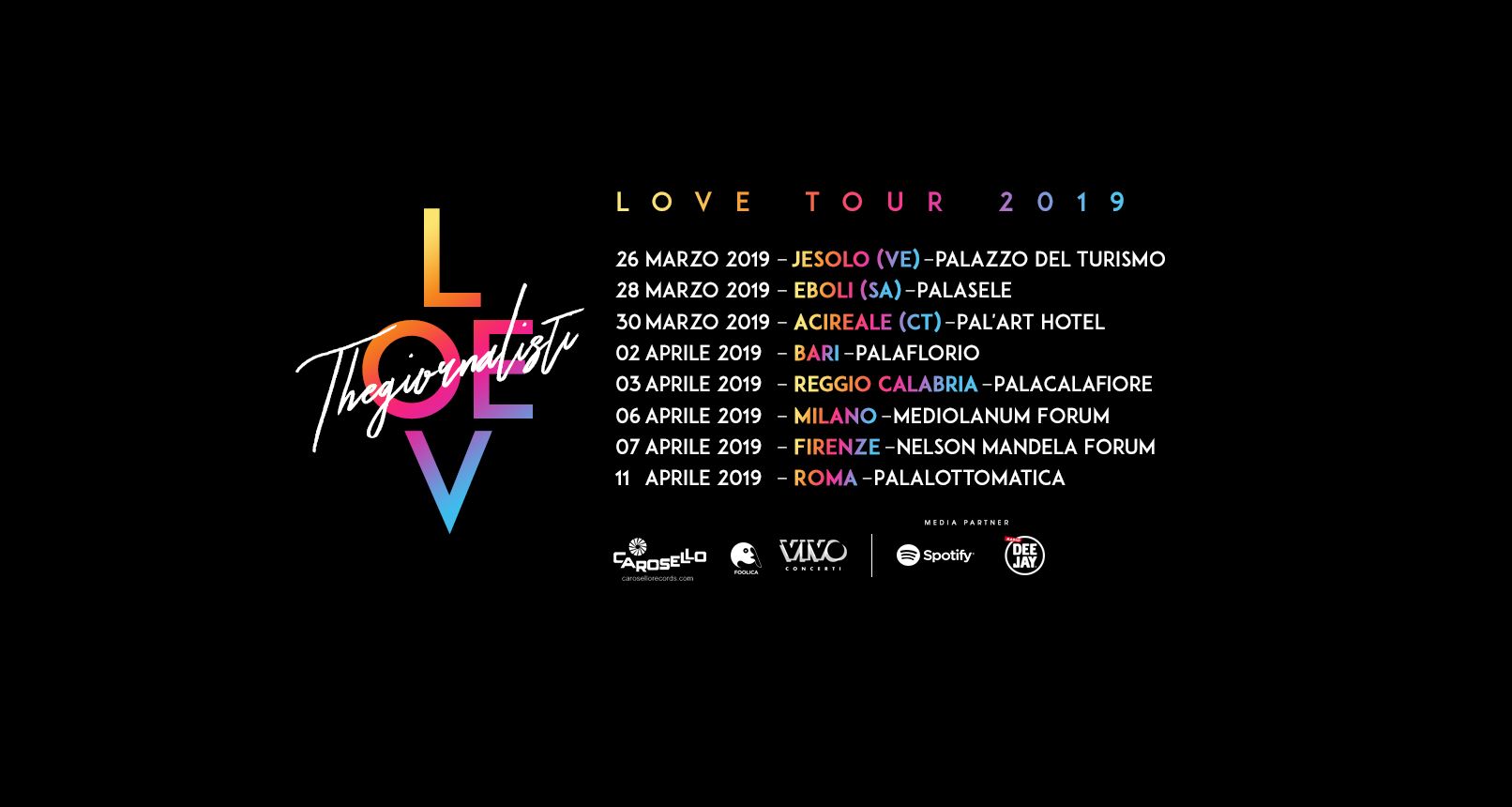 A un mese dall’inizio del “LOVE Tour 2018”, prosegue senza sosta il successo dei THEGIORNALISTI, la band capitanata da Tommaso Paradiso, pronta a tornare live nei più importanti palazzetti d’Italia dal 21 ottobre 2018. Dopo il tutto esaurito delle date di Milano, Roma, Bari, Firenze, Padova, Napoli, Vigevano e Montichiari (Brescia), a grande richiesta, la band annuncia il proprio ritorno sui palchi italiani a marzo 2019, per portare il “LOVE Tour” a Jesolo, Eboli, Acireale e Reggio Calabria ed esibirsi di nuovo anche a Bari, Milano, Firenze e Roma.