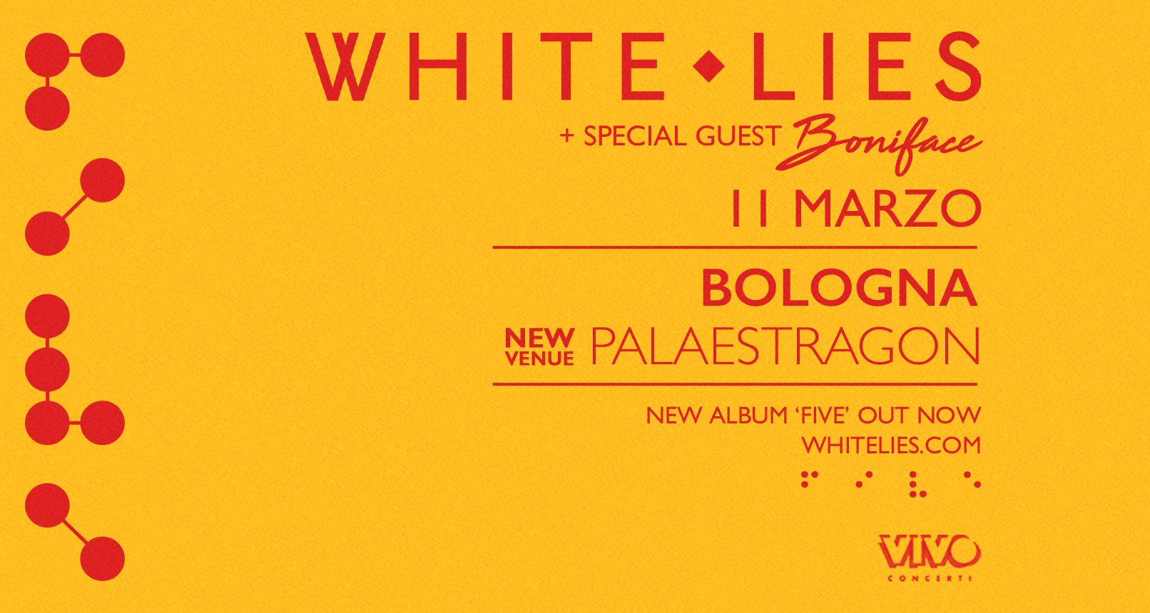 Boom di vendite per i WHITE LIES, che, per motivi legati alla grande richiesta, spostano la loro unica data italiana, prevista per lunedì 11 marzo 2019 a Bologna, in una venue di maggiore capienza, il PalaEstragon.