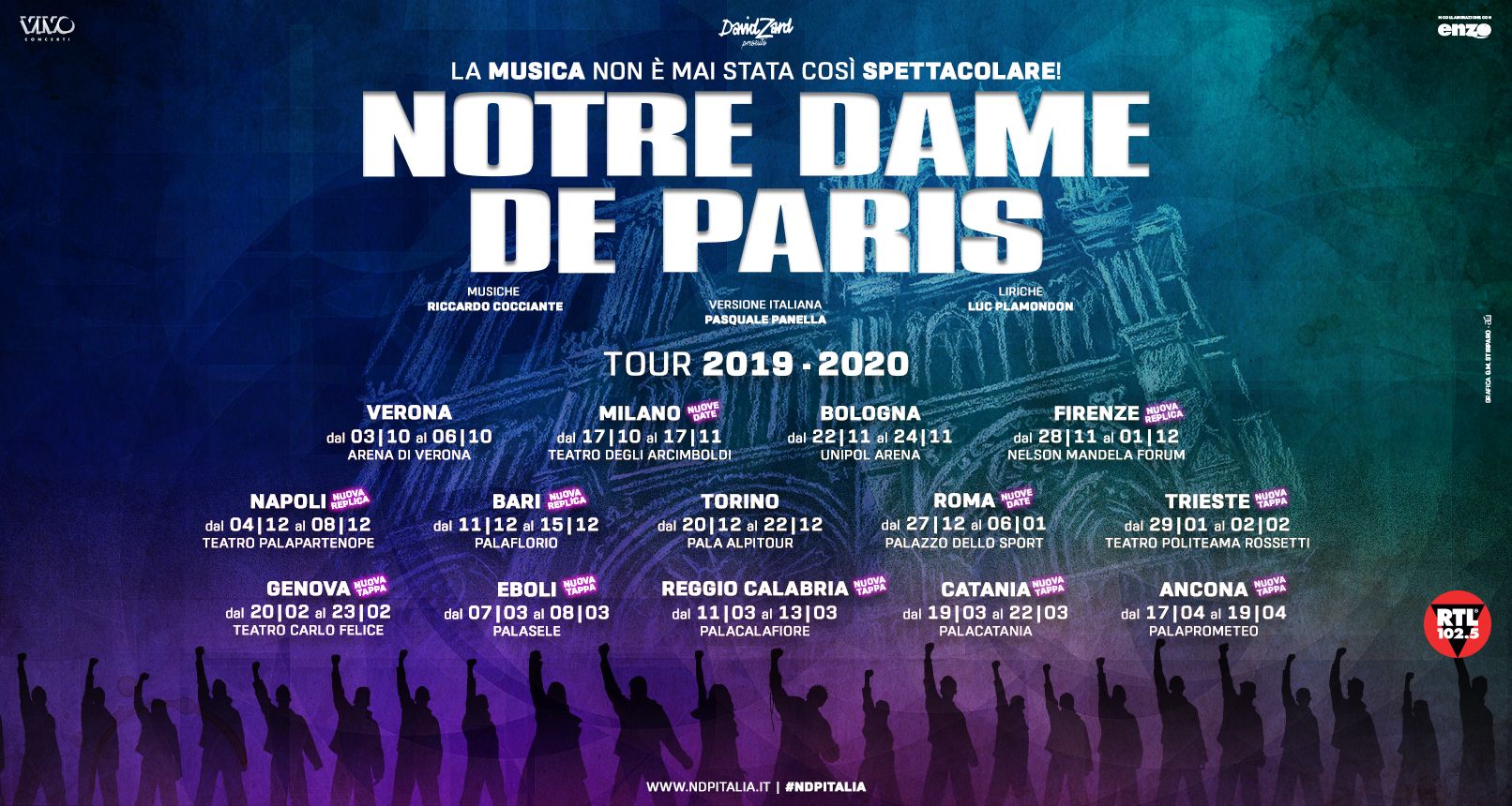 Dopo aver appassionato più di 4 milioni di spettatori solo in Italia, “Notre Dame de Paris”,uno tra i più apprezzati spettacoli teatrali mai realizzati, tratto dall’omonimo romanzo di Victor Hugo,torna a far sognare con nuove imperdibili tappe. Alle date milanesi già annunciate, infatti, si aggiungono quelle dal 12 al 17 novembre 2019, presso il Teatro Arcimboldi di Milano. Lo show sarà poi in replica il 1°,l’8 e il15 dicembre, rispettivamente a Firenze (Nelson Mandela Forum), Napoli (Teatro PalaPartenope)e Bari (PalaFlorio). La tournée riprenderà con l’anno nuovo e toccherà le città di Roma, dal 2 al 6 gennaio 2020 presso ilPalazzo Dello Sport, Trieste,dal 29 gennaio al 2 febbraio presso il Teatro Politeama Rossetti, e Genova,dal 20 al 23 febbraio presso ilTeatro Carlo Felice. L’opera moderna più famosa al mondo proseguirà poi il suo viaggio in tutt’Italia al PalaSele di Eboli, il 7 e l’8 marzo 2020, al PalaCalafiore di Reggio Calabria, dall’11 al 13 marzo, al PalaCatania di Catania, dal 19 al 22 marzoe al PalaRossini di Ancona dal 17 al 19 aprile.